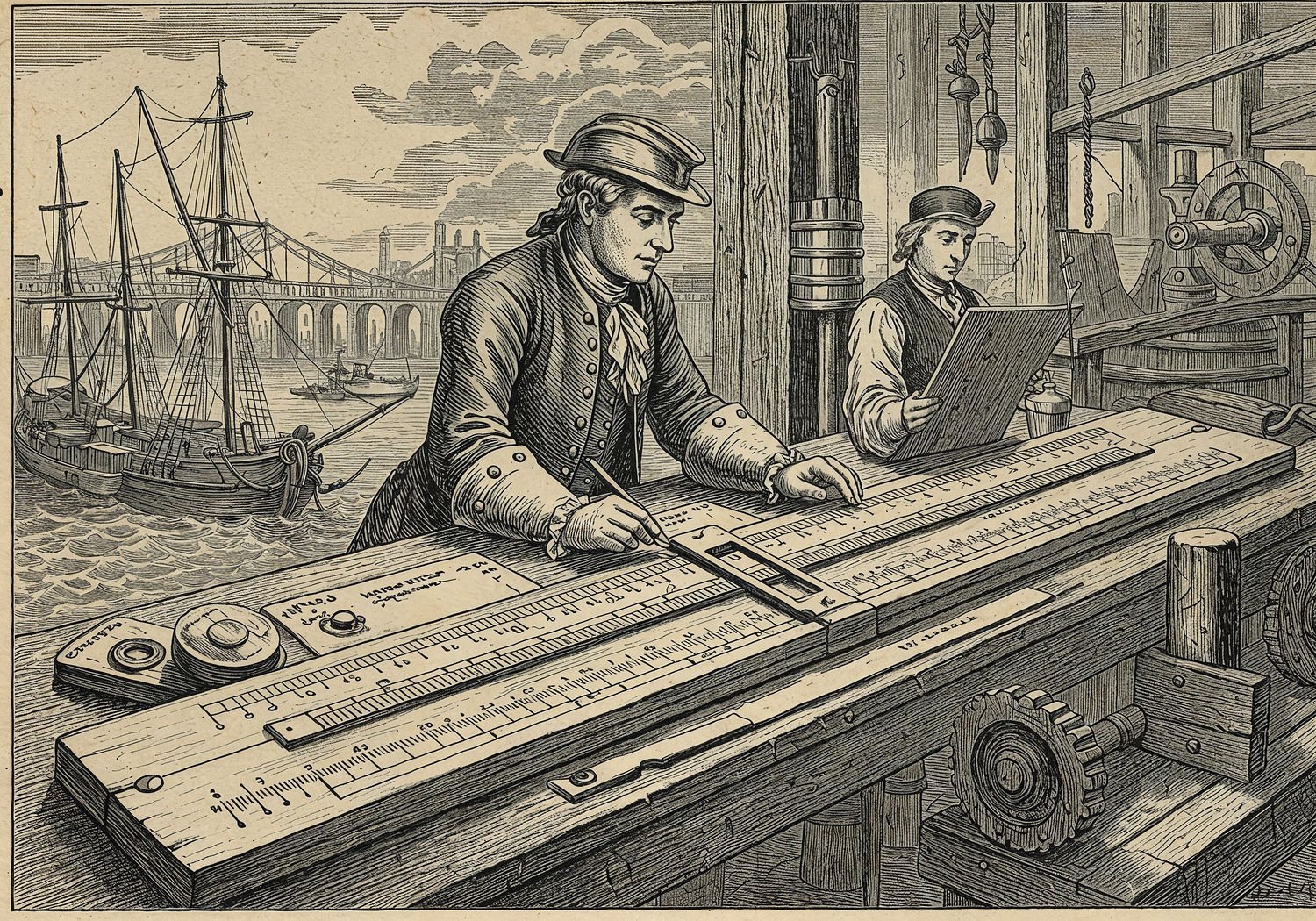 Traditional detailed engraving illustration with modern elements, etched lines, high contrast black and white, meticulous cross-hatching to create depth, printed on aged parchment paper of: Traditional detailed engraving illustration with modern elements, etched lines, high contrast black and white, meticulous cross-hatching to create depth, printed on aged parchment paper of: A historical wooden slide rule with engraved logarithmic scales on fixed and sliding parts, held by an engineer in 18th-century attire calculating on a blueprint of a bridge, with a merchant nearby using another slide rule to compute trade figures on a ledger, background showing sailing ships and early industrial machinery like steam engines. Illustration: copperplate etching texture, ink lines, dramatic shading, artistic style, deep focus, museum quality print with humorous twist. Illustration: copperplate etching texture, ink lines, dramatic shading, artistic style, deep focus, museum quality print with humorous twist.
