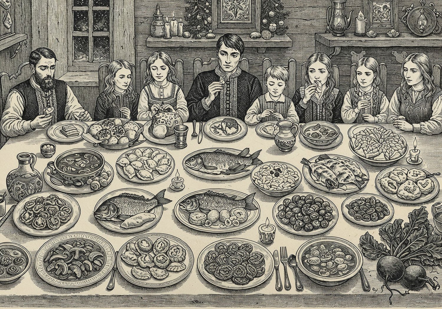 Traditional detailed engraving illustration, etched lines, high contrast black and white, meticulous cross-hatching to create depth, printed on aged parchment paper of: Traditional detailed engraving illustration, etched lines, high contrast black and white, meticulous cross-hatching to create depth, printed on aged parchment paper of: A warmly lit Polish dining room on Christmas Eve, with a long wooden table covered in a white cloth, centered on exactly twelve traditional postne dishes arranged in a semi-circle: red borscht with mushroom dumplings, pierogi filled with cabbage and mushrooms, fried carp, herring in cream sauce, vegetable salad, kutia with poppy seeds and honey, makowiec poppy seed roll, piernik gingerbread, dried fruit compote, mushroom soup, kluski with poppy seeds, and beets with horseradish. Subtle symbolic elements include twelve small candles representing the apostles and twelve evergreen branches for the months, with a family of diverse generations gathered around sharing opłatek wafers, evoking unity, abundance in simplicity, and historical reverence. Illustration: copperplate etching texture, ink lines, dramatic shading, art style inspired by Gustave Doré and Albrecht Dürer, deep focus, museum quality print. Illustration: copperplate etching texture, ink lines, dramatic shading, art style inspired by Gustave Doré and Albrecht Dürer, deep focus, museum quality print.