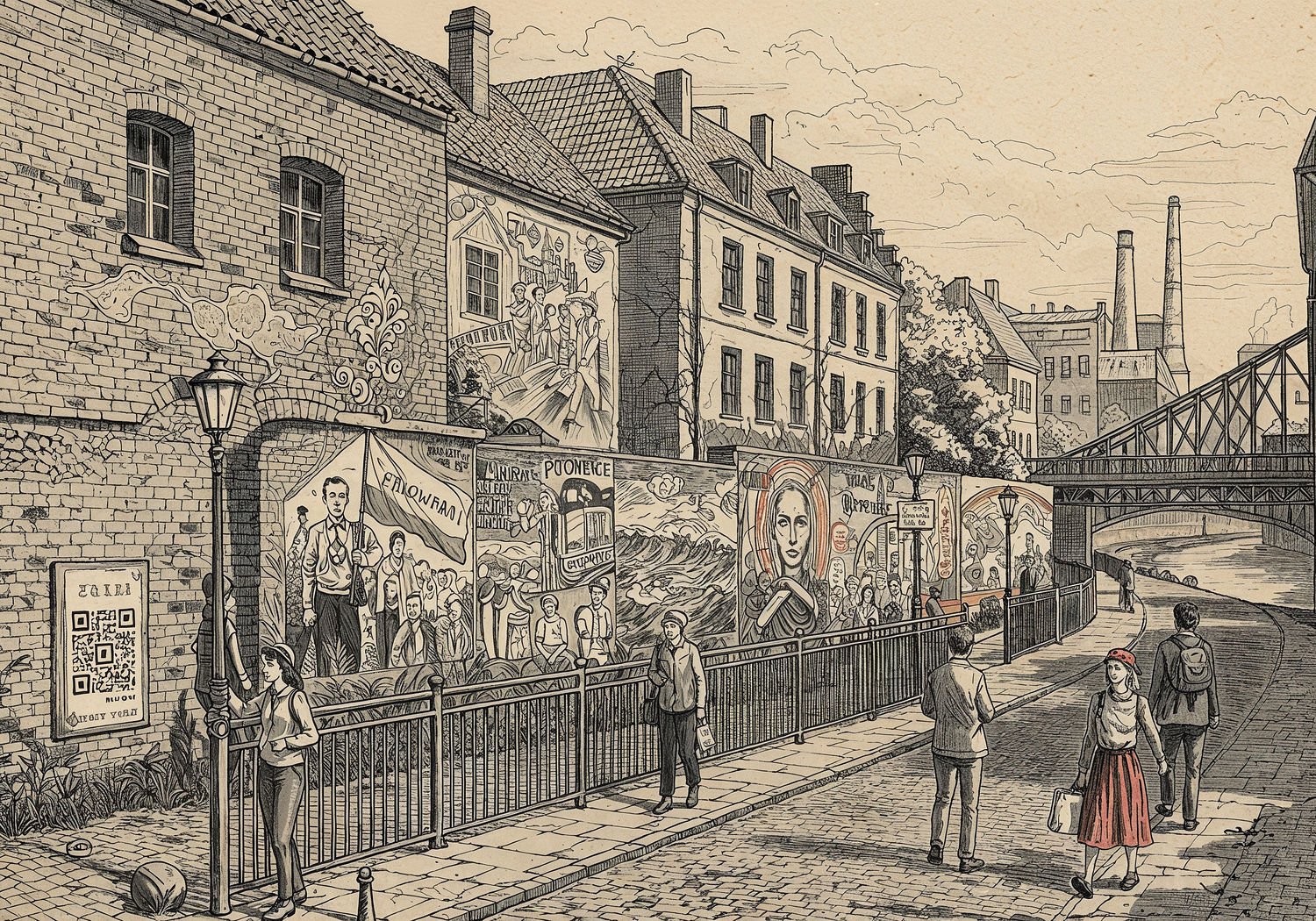 Traditional detailed engraving illustration with modern elements, etched lines, high contrast black and white, meticulous cross-hatching to create depth, printed on aged parchment paper of: Traditional detailed engraving illustration with modern elements, etched lines, high contrast black and white, meticulous cross-hatching to create depth, printed on aged parchment paper of: A vibrant street scene in Nadodrze district of Wrocław, Poland, along the Oder River, featuring a walking trail lined with colorful murals on old industrial walls and brick buildings. In the foreground, diverse pedestrians scan QR codes next to a large mural depicting 1980s Polish workers raising a Solidarity flag amid protest symbols. Nearby murals show migrants with suitcases, abstract river waves representing floods, women in factory uniforms fighting for rights, children playing under a bridge with Jewish heritage symbols, a portrait of Lech Wałęsa meeting local workers, a giant polluted fish in the river, shadowy figures from martial law era, rainbow motifs for LGBTQ+ history, migrating birds over the water, labyrinthine patterns of economic transformation, kids with a globe, post-war ruins turning into new homes, ecologists battling developers, and a community unity portrait of artists and activists. The trail starts at Grunwaldzki Bridge and ends at Warszawski Bridge, with the flowing Oder River, narrow alleys, cafes, and abandoned factories in the background, including glimpses of galleries inside repurposed industrial spaces. Illustration: copperplate etching texture, ink lines, dramatic shading, artistic style, deep focus, museum quality print with humorous twist. Illustration: copperplate etching texture, ink lines, dramatic shading, artistic style, deep focus, museum quality print with humorous twist.