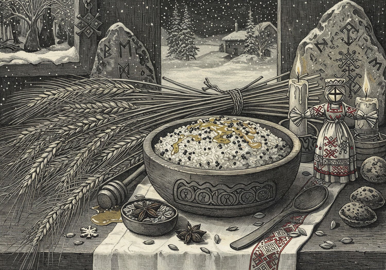 Traditional detailed engraving illustration, etched lines, high contrast black and white, meticulous cross-hatching to create depth, printed on aged parchment paper of: Traditional detailed engraving illustration, etched lines, high contrast black and white, meticulous cross-hatching to create depth, printed on aged parchment paper of: A traditional wooden bowl filled with kutia, featuring cooked wheat grains mixed with black poppy seeds and drizzled with golden honey, placed on a rustic Christmas table covered with a white cloth. Surrounding the bowl are scattered wheat sheaves, a small diduch straw doll, flickering candles, and subtle symbols of Slavic ancestors like ancient runes etched on stones, with a snowy winter landscape visible through a window in the background, evoking themes of rebirth and forgotten rituals. Illustration: copperplate etching texture, ink lines, dramatic shading, art style inspired by Gustave Doré and Albrecht Dürer, deep focus, museum quality print. Illustration: copperplate etching texture, ink lines, dramatic shading, art style inspired by Gustave Doré and Albrecht Dürer, deep focus, museum quality print.