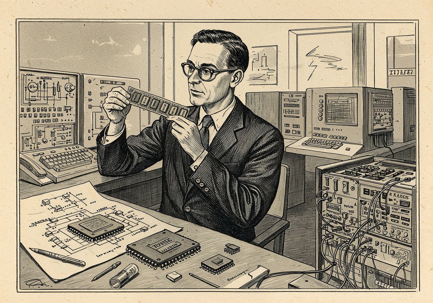 Traditional detailed engraving illustration with modern elements, etched lines, high contrast black and white, meticulous cross-hatching to create depth, printed on aged parchment paper of: Traditional detailed engraving illustration with modern elements, etched lines, high contrast black and white, meticulous cross-hatching to create depth, printed on aged parchment paper of: Jack Kilby in a 1950s laboratory at Texas Instruments, holding a small strip of germanium with integrated transistors and components etched on it, surrounded by scattered discrete transistors, resistors, and wires on a workbench, with a blueprint of the circuit nearby and a bulky early computer like UNIVAC in the background, evolving into a foreground vision of mass-produced silicon chips powering modern business computers and servers in a corporate office setting. Illustration: copperplate etching texture, ink lines, dramatic shading, artistic style, deep focus, museum quality print with humorous twist. Illustration: copperplate etching texture, ink lines, dramatic shading, artistic style, deep focus, museum quality print with humorous twist.