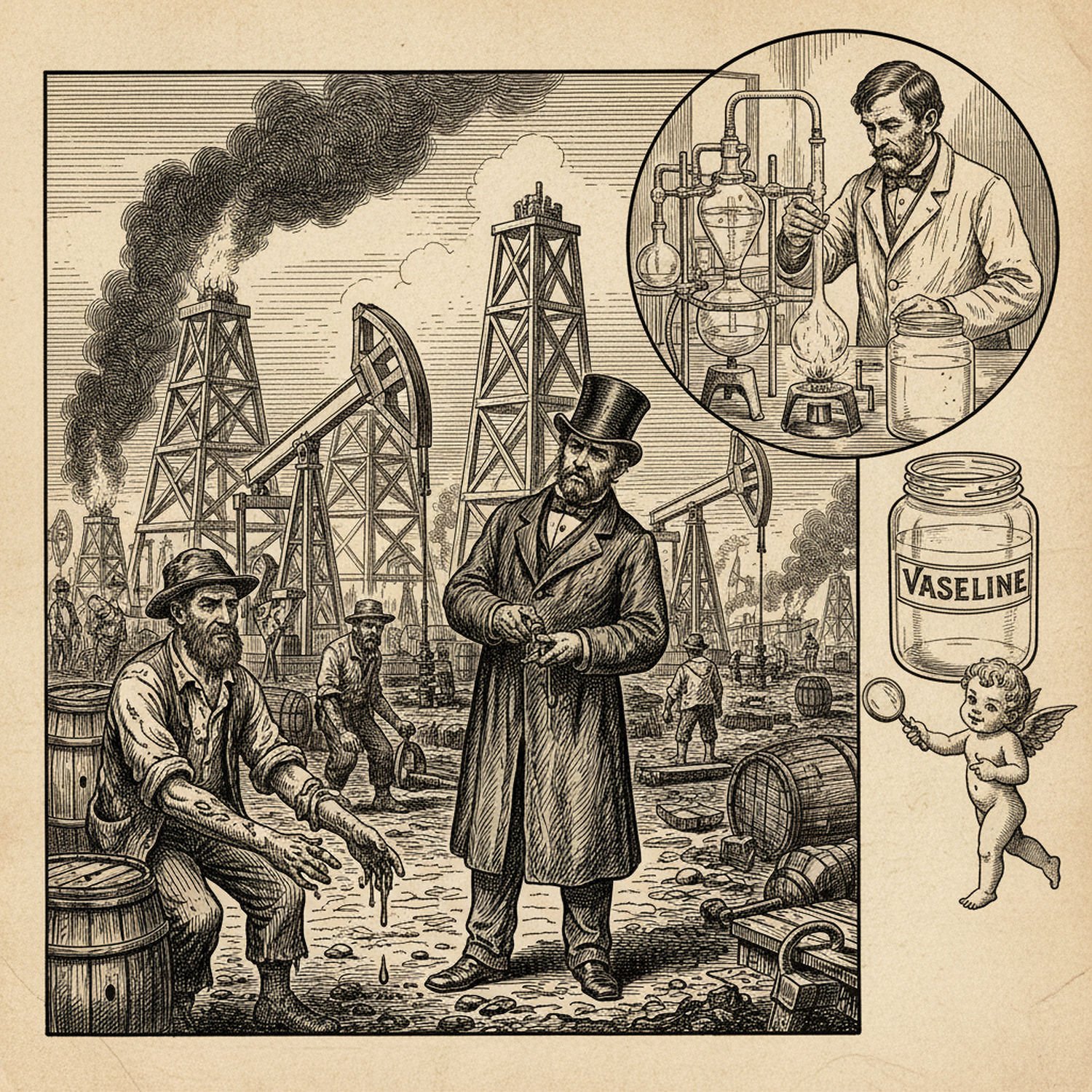 Traditional detailed engraving illustration with modern elements, etched lines, high contrast black and white, meticulous cross-hatching to create depth, printed on aged parchment paper of: Traditional detailed engraving illustration with modern elements, etched lines, high contrast black and white, meticulous cross-hatching to create depth, printed on aged parchment paper of: A 19th-century scene in Pennsylvania oil fields showing inventor Robert Chesebrough observing roughneck workers applying sticky, clear residue from oil refining to their cuts and burns on hands and arms, with wooden oil derricks and barrels of crude oil in the background, transitioning to an inset image of Chesebrough in a Brooklyn laboratory distilling petroleum in glass equipment to produce a pure, translucent jar of Vaseline jelly, symbolizing the transformation from industrial waste to skincare revolution. Illustration: copperplate etching texture, ink lines, dramatic shading, artistic style, deep focus, museum quality print with humorous twist. Illustration: copperplate etching texture, ink lines, dramatic shading, artistic style, deep focus, museum quality print with humorous twist.