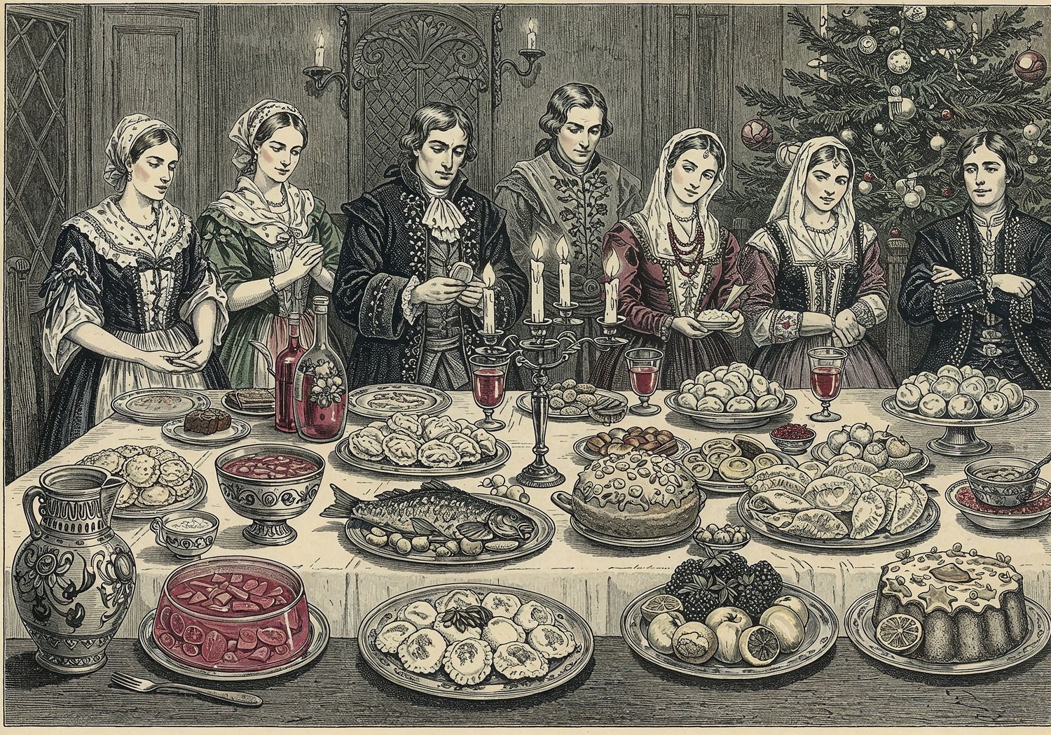 Traditional detailed engraving illustration, etched lines, high contrast black and white, meticulous cross-hatching to create depth, printed on aged parchment paper of: Traditional detailed engraving illustration, etched lines, high contrast black and white, meticulous cross-hatching to create depth, printed on aged parchment paper of: A grand 18th-century Polish noble dining hall during Christmas Eve Wigilia, with a long wooden table covered in a white linen cloth, laden with twelve traditional fasting dishes including red borscht in ornate bowls, carp in jelly on silver platters, pierogi stuffed with cabbage and mushrooms, marinated herring with onions and apples, mushroom soup, poppy seed noodles drizzled with honey, fruit compote with dried apricots and cloves, and star-shaped piernik cake decorated with sugar angels. Surrounding the table are elegantly dressed noblemen and women in historical attire, breaking opłatek wafers, with beeswax candles, evergreen branches, and a Christmas tree in the background, servants attending discreetly, evoking a blend of luxury and religious austerity. Illustration: copperplate etching texture, ink lines, dramatic shading, art style inspired by Gustave Doré and Albrecht Dürer, deep focus, museum quality print. Illustration: copperplate etching texture, ink lines, dramatic shading, art style inspired by Gustave Doré and Albrecht Dürer, deep focus, museum quality print.
