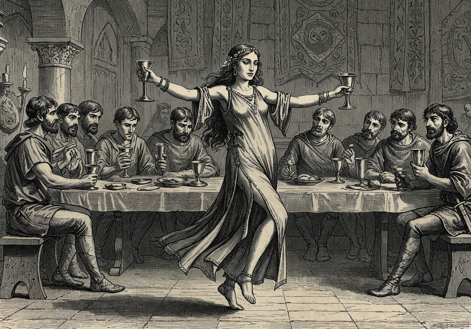 Traditional detailed engraving illustration with modern elements, etched lines, high contrast black and white, meticulous cross-hatching to create depth, printed on aged parchment paper of: Traditional detailed engraving illustration with modern elements, etched lines, high contrast black and white, meticulous cross-hatching to create depth, printed on aged parchment paper of: A noble Visigothic woman in a long ankle-length tunic made of linen with asymmetrical slits on one side reaching mid-thigh, dancing gracefully in a 5th-century Iberian court hall, her garment flowing dynamically to reveal subtle leg movement, surrounded by male courtiers in knee-length wool tunics with similar irregular side cuts, holding goblets during a feast, with architectural elements like stone arches and tapestries in the background, evoking a blend of Roman elegance and barbarian practicality. Illustration: copperplate etching texture, ink lines, dramatic shading, artistic style, deep focus, museum quality print with humorous twist. Illustration: copperplate etching texture, ink lines, dramatic shading, artistic style, deep focus, museum quality print with humorous twist.