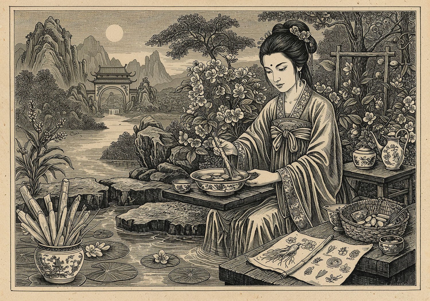Traditional detailed engraving illustration with modern elements, etched lines, high contrast black and white, meticulous cross-hatching to create depth, printed on aged parchment paper of: Traditional detailed engraving illustration with modern elements, etched lines, high contrast black and white, meticulous cross-hatching to create depth, printed on aged parchment paper of: A serene ancient Chinese garden at dawn, featuring a graceful woman in traditional hanfu preparing a herbal tonic by steeping ginseng roots and jasmine flowers in a porcelain bowl, with yin-yang symbols subtly integrated into the flowing water and blooming plants, ancient scrolls open nearby showing herbal illustrations, her radiant youthful skin glowing softly, surrounded by balanced natural elements like misty mountains and harmonious foliage representing vitality and eternal youth. Illustration: copperplate etching texture, ink lines, dramatic shading, artistic style, deep focus, museum quality print with humorous twist. Illustration: copperplate etching texture, ink lines, dramatic shading, artistic style, deep focus, museum quality print with humorous twist.