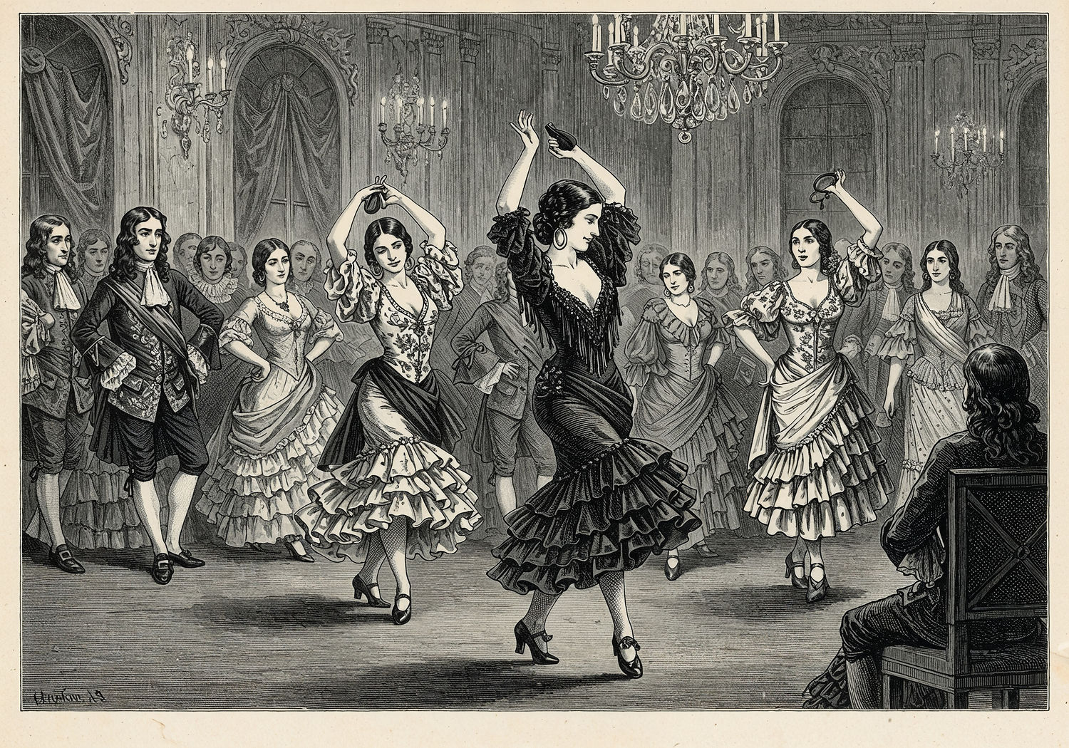 Traditional detailed engraving illustration with modern elements, etched lines, high contrast black and white, meticulous cross-hatching to create depth, printed on aged parchment paper of: Traditional detailed engraving illustration with modern elements, etched lines, high contrast black and white, meticulous cross-hatching to create depth, printed on aged parchment paper of: A group of Spanish bolero dancers performing energetically on the grand stage of Versailles palace during Louis XIV’s court, wearing lace blouses that expose shoulders and midriffs adorned with floral embroidery, paired with tight-fitting skirts that hug the hips and end above the ankles, holding castanets and clapping hands mid-turn, surrounded by elegant French aristocrats in period attire watching in fascination, with ornate chandeliers and mirrored walls in the background. Illustration: copperplate etching texture, ink lines, dramatic shading, artistic style, deep focus, museum quality print with humorous twist. Illustration: copperplate etching texture, ink lines, dramatic shading, artistic style, deep focus, museum quality print with humorous twist.