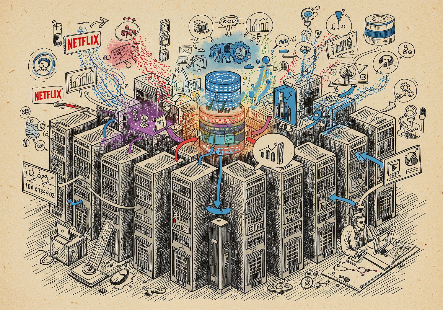 Traditional detailed engraving illustration with modern elements, etched lines, high contrast black and white, meticulous cross-hatching to create depth, printed on aged parchment paper of: Traditional detailed engraving illustration with modern elements, etched lines, high contrast black and white, meticulous cross-hatching to create depth, printed on aged parchment paper of: A massive cluster of interconnected servers forming a digital landscape, with streams of colorful data particles representing petabytes of information flowing into a central Hadoop elephant icon, where the data is processed through glowing MapReduce gears and HDFS blocks, emerging as predictive charts, graphs, and trend lines forecasting business metrics like sales spikes, fraud alerts, and customer behaviors, surrounded by icons of companies such as Netflix, Walmart, and Amazon, with a CEO figure at a dashboard viewing data-driven insights and future projections. Illustration: copperplate etching texture, ink lines, dramatic shading, artistic style, deep focus, museum quality print with humorous twist. Illustration: copperplate etching texture, ink lines, dramatic shading, artistic style, deep focus, museum quality print with humorous twist.