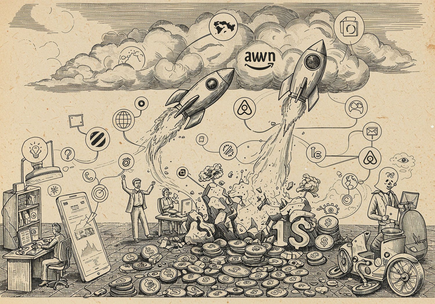 Traditional detailed engraving illustration with modern elements, etched lines, high contrast black and white, meticulous cross-hatching to create depth, printed on aged parchment paper of: Traditional detailed engraving illustration with modern elements, etched lines, high contrast black and white, meticulous cross-hatching to create depth, printed on aged parchment paper of: A dynamic scene showing a small startup team in a modest office, excitedly launching a rocket-shaped app into a vast cloud formation labeled „AWS”, with traditional heavy servers crumbling below into coins and dollar bills, while scalable virtual machines and data streams expand outward to connect global icons like Netflix, Airbnb, and Brainly logos, symbolizing cost savings, growth, and innovation without financial barriers. Illustration: copperplate etching texture, ink lines, dramatic shading, artistic style, deep focus, museum quality print with humorous twist. Illustration: copperplate etching texture, ink lines, dramatic shading, artistic style, deep focus, museum quality print with humorous twist.
