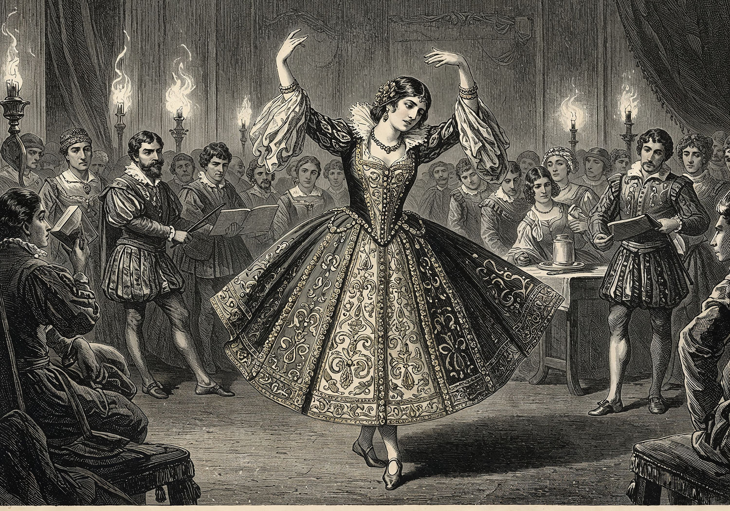 Tancerki dworskie w XVI wieku Portugalii podnosiły modę do rangi performansu, a suknie z haftami i siateczkami stały się kluczowym elementem ich artystycznej ekspresji. Wprowadzone na dwór za panowania Jana III, te tańce czerpały z marokańskich tradycji, takich jak gnawa – rytualne ruchy z Afryki Subsaharyjskiej, adaptowane do europejskich choreografii. Tancerki, często pochodzące z mieszanych środowisk – portugalsko-marokańskich rodzin kupieckich – ubierały się w te unikalne kreacje, by tworzyć hipnotyzujące widowiska.
