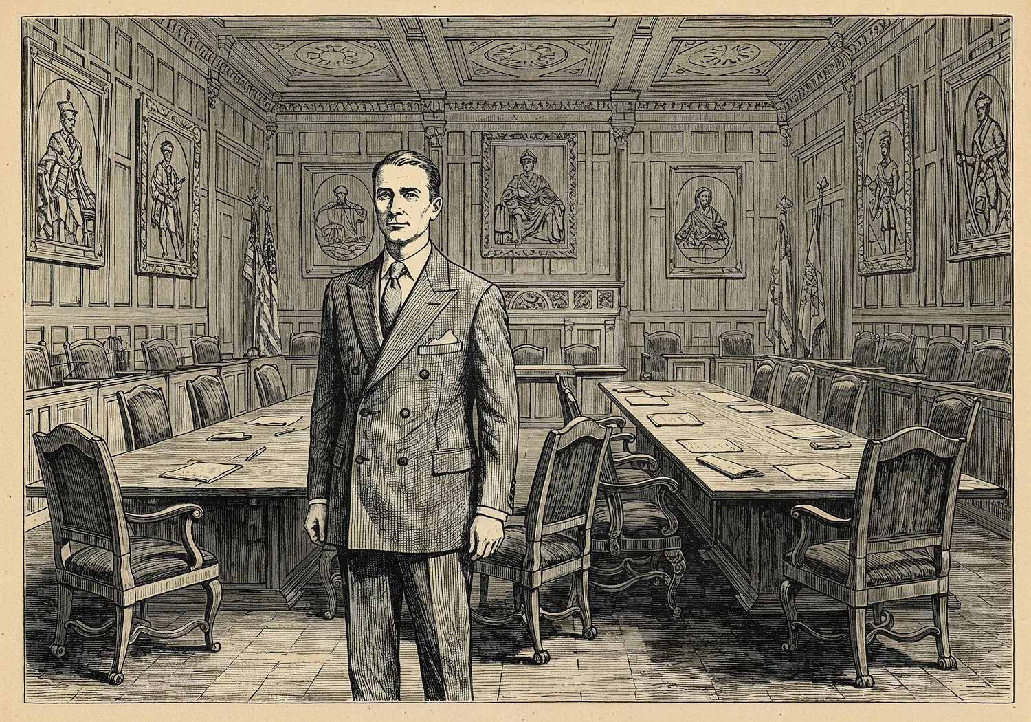Traditional detailed engraving illustration with modern elements, etched lines, high contrast black and white, meticulous cross-hatching to create depth, printed on aged parchment paper of: Traditional detailed engraving illustration with modern elements, etched lines, high contrast black and white, meticulous cross-hatching to create depth, printed on aged parchment paper of: A confident man in a classic gray double-breasted suit with peak lapels, white dress shirt, and subtle striped tie, standing in a grand town hall meeting room with high ceilings, ornate wooden panels, portraits of historical figures on the walls, and a large mahogany table in the background, exuding professionalism and elegance. Illustration: copperplate etching texture, ink lines, dramatic shading, artistic style, deep focus, museum quality print with humorous twist. Illustration: copperplate etching texture, ink lines, dramatic shading, artistic style, deep focus, museum quality print with humorous twist.