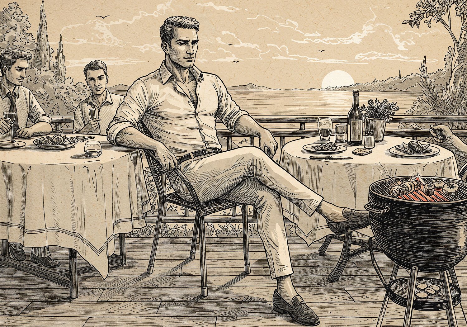 Traditional detailed engraving illustration with modern elements, etched lines, high contrast black and white, meticulous cross-hatching to create depth, printed on aged parchment paper of: Traditional detailed engraving illustration with modern elements, etched lines, high contrast black and white, meticulous cross-hatching to create depth, printed on aged parchment paper of: A man with an athletic build, wearing a slim-fit off-white button-down shirt with rolled-up sleeves that accentuate his biceps and chest, paired with slim beige chinos ending at the ankles and brown leather loafers, sitting relaxed at an outdoor restaurant terrace table during a warm summer evening, surrounded by friends, with grilled food, fresh herbs, and a scenic sunset view in the background. Illustration: copperplate etching texture, ink lines, dramatic shading, artistic style, deep focus, museum quality print with humorous twist. Illustration: copperplate etching texture, ink lines, dramatic shading, artistic style, deep focus, museum quality print with humorous twist.