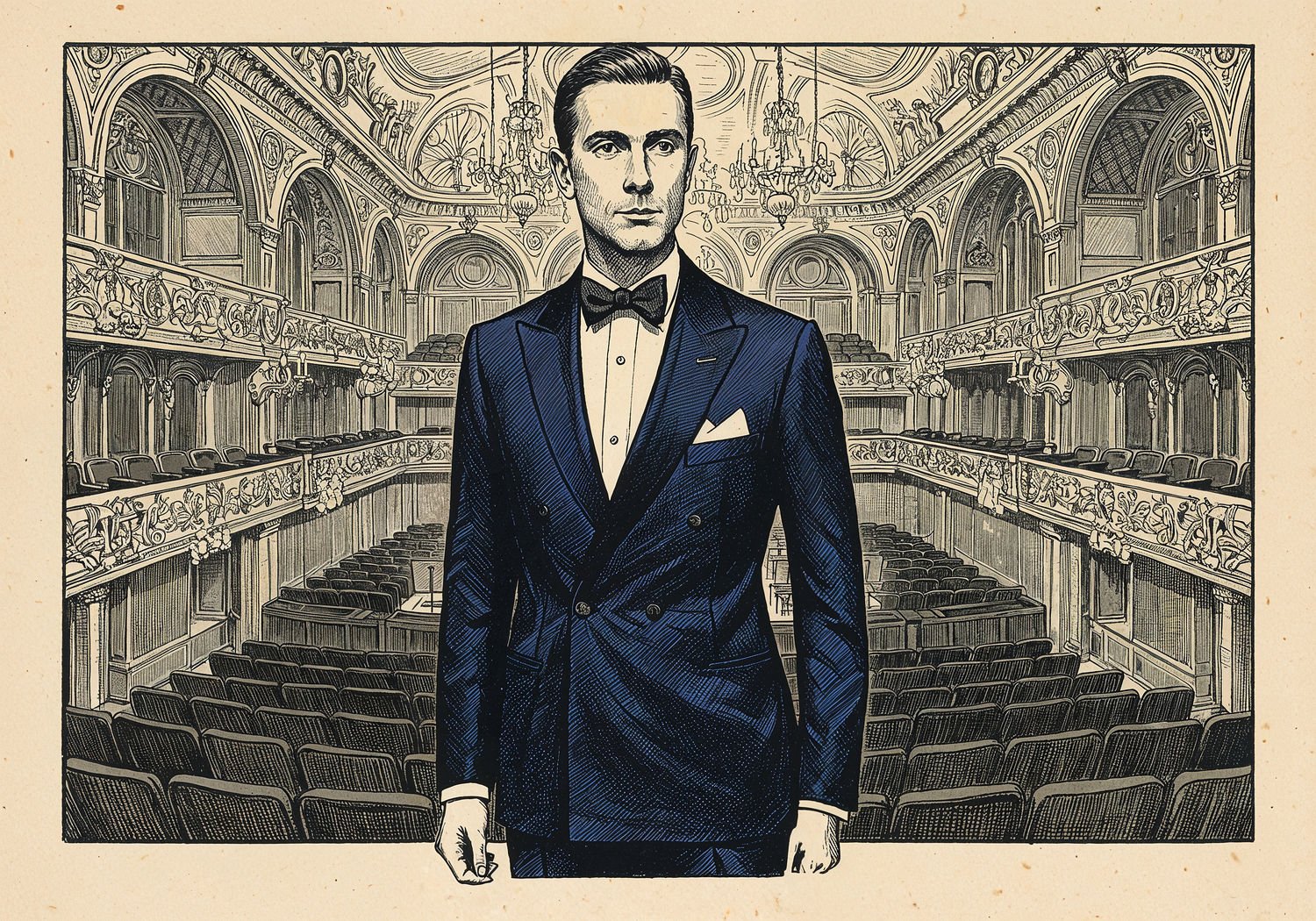 Traditional detailed engraving illustration with modern elements, etched lines, high contrast black and white, meticulous cross-hatching to create depth, printed on aged parchment paper of: Traditional detailed engraving illustration with modern elements, etched lines, high contrast black and white, meticulous cross-hatching to create depth, printed on aged parchment paper of: A sophisticated man in a deep navy blue single-breasted evening suit with peak lapels, white dress shirt, and black silk bow tie, standing confidently in the grand foyer of a philharmonic hall, with ornate chandeliers overhead, velvet seating in the background, and the faint silhouette of an orchestra on stage visible through arched doorways. Illustration: copperplate etching texture, ink lines, dramatic shading, artistic style, deep focus, museum quality print with humorous twist. Illustration: copperplate etching texture, ink lines, dramatic shading, artistic style, deep focus, museum quality print with humorous twist.