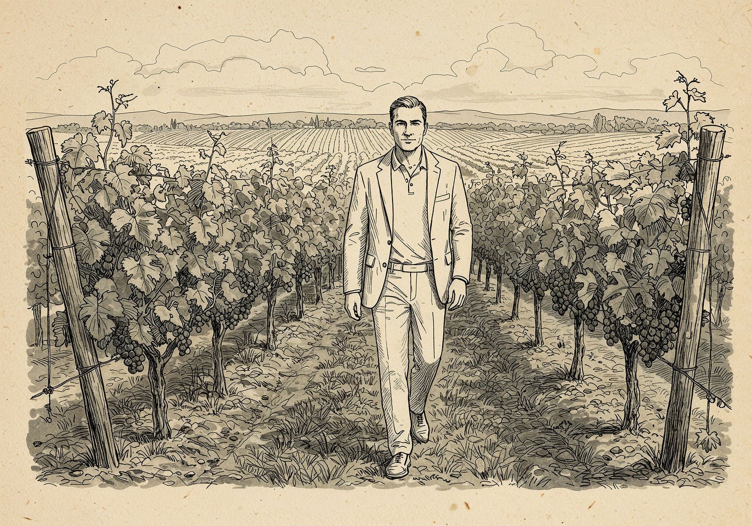 Traditional detailed engraving illustration with modern elements, etched lines, high contrast black and white, meticulous cross-hatching to create depth, printed on aged parchment paper of: Traditional detailed engraving illustration with modern elements, etched lines, high contrast black and white, meticulous cross-hatching to create depth, printed on aged parchment paper of: A man in an elegant summer outfit—a cream linen blazer, white polo shirt tucked loosely, and beige straight-leg pants—strolling relaxed through rows of lush green grapevines in a sunlit vineyard on a warm afternoon, with golden sunlight filtering through the leaves, distant hills in the background, and a light breeze suggested by subtle movement in the vines. Illustration: copperplate etching texture, ink lines, dramatic shading, artistic style, deep focus, museum quality print with humorous twist. Illustration: copperplate etching texture, ink lines, dramatic shading, artistic style, deep focus, museum quality print with humorous twist.