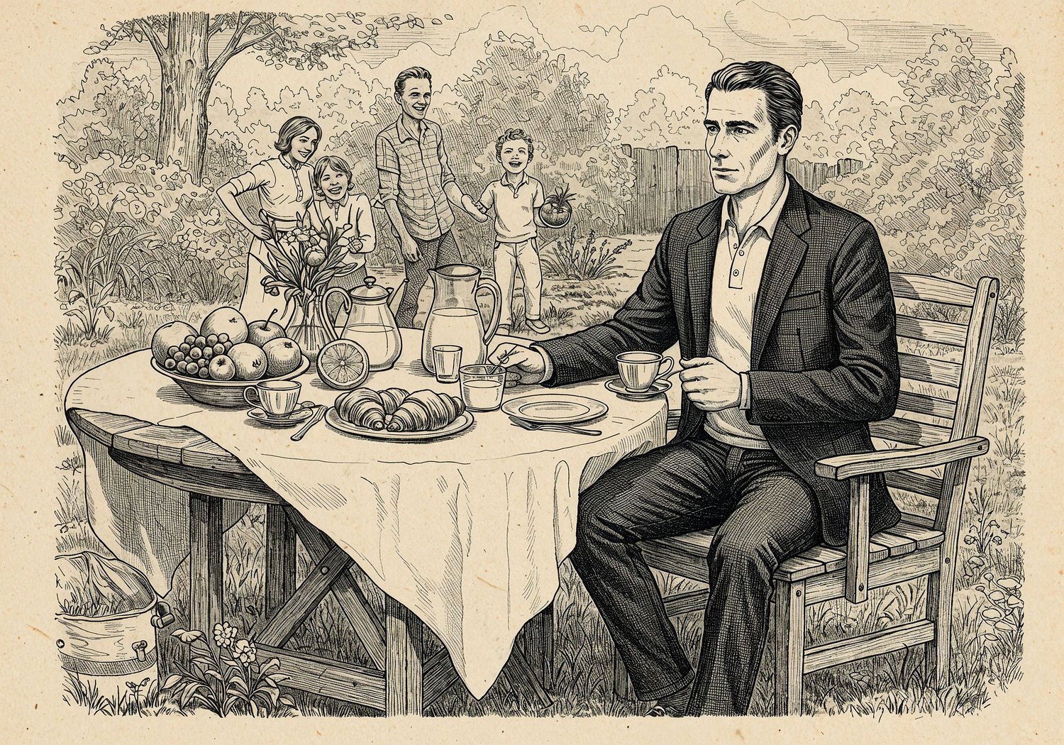Traditional detailed engraving illustration with modern elements, etched lines, high contrast black and white, meticulous cross-hatching to create depth, printed on aged parchment paper of: Traditional detailed engraving illustration with modern elements, etched lines, high contrast black and white, meticulous cross-hatching to create depth, printed on aged parchment paper of: A man in his 30s wearing a dark gray herringbone blazer over a white polo shirt and slim dark indigo jeans, seated at a wooden garden table covered with a white tablecloth, featuring fresh fruits, croissants, coffee cups, and juice pitchers; family members including a woman and two children laughing in the background among green trees and grass; relaxed weekend brunch atmosphere in a sunny garden. Illustration: copperplate etching texture, ink lines, dramatic shading, artistic style, deep focus, museum quality print with humorous twist. Illustration: copperplate etching texture, ink lines, dramatic shading, artistic style, deep focus, museum quality print with humorous twist.