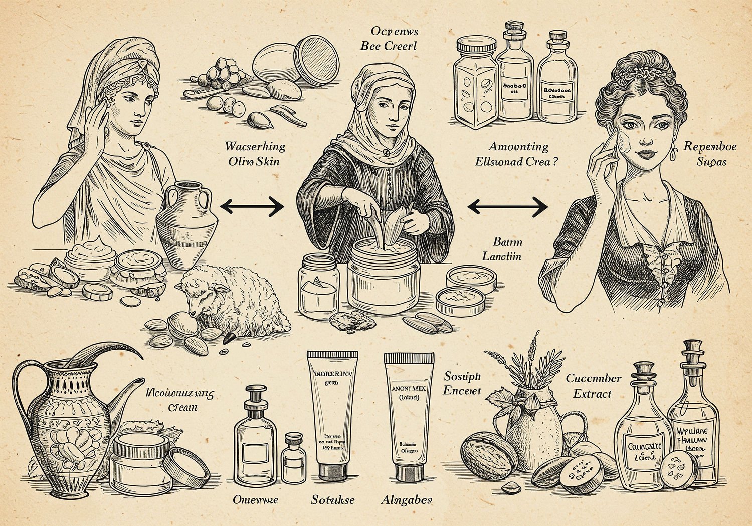 Traditional detailed engraving illustration with modern elements, etched lines, high contrast black and white, meticulous cross-hatching to create depth, printed on aged parchment paper of: Traditional detailed engraving illustration with modern elements, etched lines, high contrast black and white, meticulous cross-hatching to create depth, printed on aged parchment paper of: A historical timeline illustration depicting the evolution of moisturizing creams across eras: on the left, an ancient Greek woman applying cold cream from a clay amphora, surrounded by beeswax, olive oil, and rose water ingredients; in the center, a medieval noblewoman mixing almond milk and lanolin into a balm in a silver jar, with sheep wool and ground almonds nearby; on the right, a Victorian lady elegantly using a white porcelain tube of elixir on her pale skin, featuring cucumber extracts and glycerin bottles; connecting the scenes, faint icons of evolving packaging from simple pots to ornate tubes, with ethereal rejuvenation auras around each figure’s glowing face. Illustration: copperplate etching texture, ink lines, dramatic shading, artistic style, deep focus, museum quality print with humorous twist. Illustration: copperplate etching texture, ink lines, dramatic shading, artistic style, deep focus, museum quality print with humorous twist.