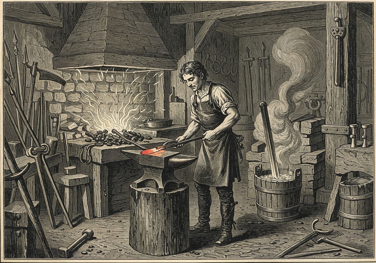 Traditional detailed engraving illustration with modern elements, etched lines, high contrast black and white, meticulous cross-hatching to create depth, printed on aged parchment paper of: Traditional detailed engraving illustration with modern elements, etched lines, high contrast black and white, meticulous cross-hatching to create depth, printed on aged parchment paper of: An ancient blacksmith in a dimly lit forge, forging a porous iron bloom on an anvil with a heavy hammer, glowing red-hot metal under sparks, transitioning to quenching a sharp sword blade in a bucket of water, steam rising, surrounded by tools, charcoal fire, and historical artifacts like sickles and spears. Illustration: copperplate etching texture, ink lines, dramatic shading, artistic style, deep focus, museum quality print with humorous twist. Illustration: copperplate etching texture, ink lines, dramatic shading, artistic style, deep focus, museum quality print with humorous twist.