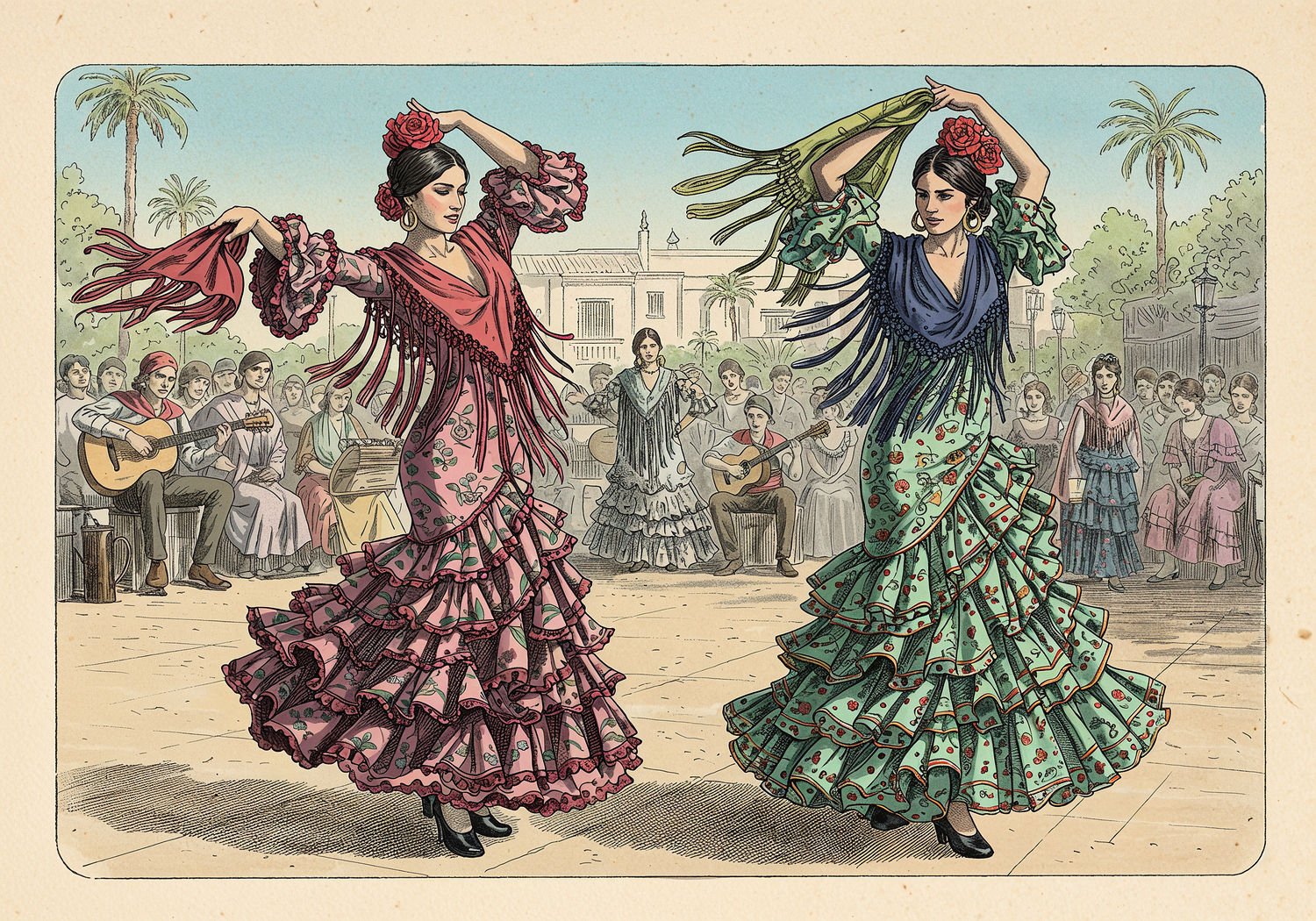 Sevillanas narodziły się w XVI wieku w Sewilli, stolicy Andaluzji, jako uproszczona wersja tańców dworskich inspirowanych seguidilla i innymi formami z epoki renesansu. Początkowo tańczono je w arystokratycznych kręgach, gdzie pary w eleganckich strojach prezentowały finezję ruchów, naśladując dworskie maniery. Z czasem, pod wpływem ludowych tradycji flamenco, sevillanas zeszły na ulice i place, stając się tańcem zbiorowym podczas świąt religijnych i festiwali. To właśnie ta dworska adaptacja w Andaluzji nadała im unikalny charakter – połączenie szlachetności z witalnością ludu.