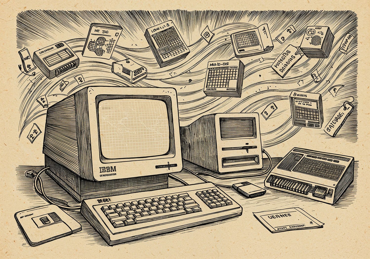 Traditional detailed engraving illustration with modern elements, etched lines, high contrast black and white, meticulous cross-hatching to create depth, printed on aged parchment paper of: Traditional detailed engraving illustration with modern elements, etched lines, high contrast black and white, meticulous cross-hatching to create depth, printed on aged parchment paper of: An iconic 1981 IBM PC computer displayed prominently on a desk with its monochrome monitor, keyboard, and floppy drive, surrounded by a diverse array of emerging clone computers from companies like Compaq, Dell, and Gateway, all connected via cables to represent compatibility; in the background, streams of software icons including Lotus 1-2-3 spreadsheet, MS-DOS interface, WordPerfect word processor, and dBase database float outward like expanding waves, illustrating the birth of a vast business software ecosystem; subtle elements of falling price tags and global maps show market growth and worldwide adoption. Illustration: copperplate etching texture, ink lines, dramatic shading, artistic style, deep focus, museum quality print with humorous twist. Illustration: copperplate etching texture, ink lines, dramatic shading, artistic style, deep focus, museum quality print with humorous twist.