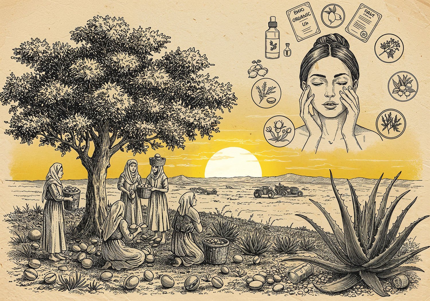 Traditional detailed engraving illustration with modern elements, etched lines, high contrast black and white, meticulous cross-hatching to create depth, printed on aged parchment paper of: Traditional detailed engraving illustration with modern elements, etched lines, high contrast black and white, meticulous cross-hatching to create depth, printed on aged parchment paper of: A serene landscape blending ancient and modern elements: in the foreground, a diverse group of women from Moroccan cooperatives harvesting argan nuts from argan trees under a golden sunset, with aloe vera plants growing nearby; in the background, a contemporary woman with glowing skin applying natural oil and aloe gel to her face, surrounded by floating icons of organic certificates, fresh herbs, and discarded synthetic chemical bottles; earthy tones dominate, symbolizing purity and return to nature. Illustration: copperplate etching texture, ink lines, dramatic shading, artistic style, deep focus, museum quality print with humorous twist. Illustration: copperplate etching texture, ink lines, dramatic shading, artistic style, deep focus, museum quality print with humorous twist.