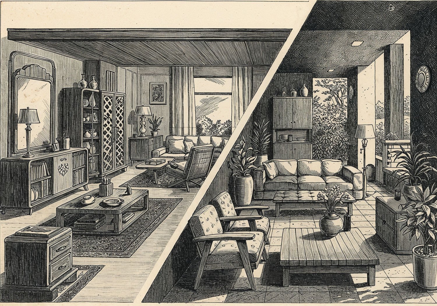Traditional detailed engraving illustration with modern elements, etched lines, high contrast black and white, meticulous cross-hatching to create depth, printed on aged parchment paper of: Traditional detailed engraving illustration with modern elements, etched lines, high contrast black and white, meticulous cross-hatching to create depth, printed on aged parchment paper of: A split-scene illustration showing the evolution of interior design: on the left, an opulent Art Deco living room with geometric patterns, chromed furniture, zigzags, and ornate carvings on wooden cabinets and mirrors; in the center, a Mid-Century Modern space with clean-lined wooden chairs like Eames models, open layouts, neutral upholstery, and minimal natural wood elements; on the right, a contemporary minimalist room with simple modular sofas, neutral walls, geometric wall panels, potted plants, and open kitchen blending into a serene garden terrace with wooden benches. Illustration: copperplate etching texture, ink lines, dramatic shading, artistic style, deep focus, museum quality print with humorous twist. Illustration: copperplate etching texture, ink lines, dramatic shading, artistic style, deep focus, museum quality print with humorous twist.