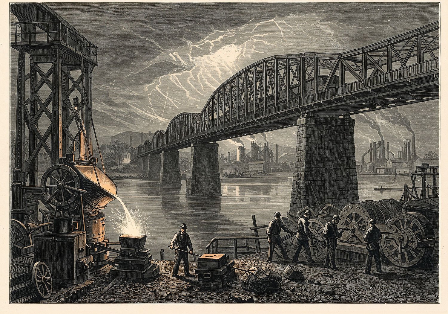Traditional detailed engraving illustration with modern elements, etched lines, high contrast black and white, meticulous cross-hatching to create depth, printed on aged parchment paper of: Traditional detailed engraving illustration with modern elements, etched lines, high contrast black and white, meticulous cross-hatching to create depth, printed on aged parchment paper of: A majestic 19th-century steel bridge spanning a wide river, with intricate truss and cantilever structures made of riveted steel beams, a steam train crossing it during a stormy sky, in the foreground a Bessemer converter pouring molten steel into molds, workers in period clothing forging bridge elements, and in the background a steel mill with smoke rising, symbolizing industrial revolution and engineering progress. Illustration: copperplate etching texture, ink lines, dramatic shading, artistic style, deep focus, museum quality print with humorous twist. Illustration: copperplate etching texture, ink lines, dramatic shading, artistic style, deep focus, museum quality print with humorous twist.