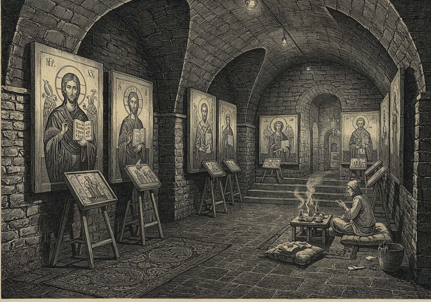 Traditional detailed engraving illustration with modern elements, etched lines, high contrast black and white, meticulous cross-hatching to create depth, printed on aged parchment paper of: Traditional detailed engraving illustration with modern elements, etched lines, high contrast black and white, meticulous cross-hatching to create depth, printed on aged parchment paper of: A dimly lit underground basement gallery in an old Krakow building, with low stone vaults and narrow stone stairs leading down into the space. Several Orthodox icons on wooden panels line the walls, featuring golden halos and robes on figures like the Virgin Mary, Christ Pantocrator, and Saint Nicholas, their surfaces glowing softly from flickering candle flames placed on small stands. A single visitor sits quietly in contemplation on a cushioned mat facing one icon, while in the background a small table holds steaming cups of herbal tea amidst subtle shadows and a misty, serene atmosphere. Illustration: copperplate etching texture, ink lines, dramatic shading, artistic style, deep focus, museum quality print with humorous twist. Illustration: copperplate etching texture, ink lines, dramatic shading, artistic style, deep focus, museum quality print with humorous twist.