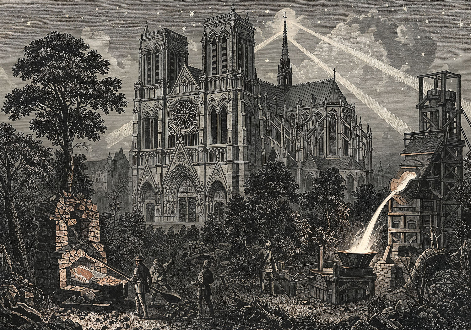 Traditional detailed engraving illustration with modern elements, etched lines, high contrast black and white, meticulous cross-hatching to create depth, printed on aged parchment paper of: Traditional detailed engraving illustration with modern elements, etched lines, high contrast black and white, meticulous cross-hatching to create depth, printed on aged parchment paper of: A majestic Gothic cathedral like Notre-Dame in Paris, with intricate iron grilles protecting rose windows featuring floral and angelic motifs, massive iron door fittings on the grand portals depicting biblical scenes, and hidden iron supports reinforcing the stone arches and vaults; in the foreground, medieval workers at a bloomery furnace in a dense forest extract porous pig iron from glowing ore, while nearby a blast furnace pours molten cast iron into molds for architectural elements, symbolizing the transformation from raw metal to divine structure under a starry sky with rays of light piercing through. Illustration: copperplate etching texture, ink lines, dramatic shading, artistic style, deep focus, museum quality print with humorous twist. Illustration: copperplate etching texture, ink lines, dramatic shading, artistic style, deep focus, museum quality print with humorous twist.