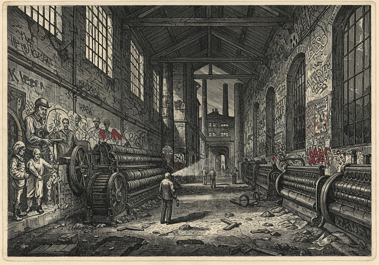 Traditional detailed engraving illustration with modern elements, etched lines, high contrast black and white, meticulous cross-hatching to create depth, printed on aged parchment paper of: Traditional detailed engraving illustration with modern elements, etched lines, high contrast black and white, meticulous cross-hatching to create depth, printed on aged parchment paper of: An abandoned industrial factory hall in Łódź at night, with cracked concrete walls and rusted machinery overgrown with graffiti murals depicting historical textile workers and symbols of rebirth, beams of flashlight light illuminating vibrant street art stencils and wheatpasted posters on the walls, a small group of urban explorers in sturdy boots and jackets carefully navigating the debris-strewn floor amidst empty corridors and high chimneys visible through broken windows. Illustration: copperplate etching texture, ink lines, dramatic shading, artistic style, deep focus, museum quality print with humorous twist. Illustration: copperplate etching texture, ink lines, dramatic shading, artistic style, deep focus, museum quality print with humorous twist.