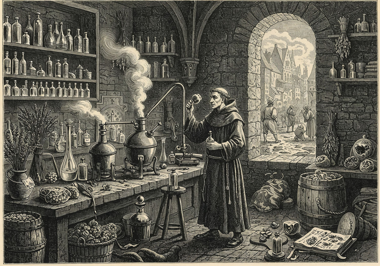Traditional detailed engraving illustration with modern elements, etched lines, high contrast black and white, meticulous cross-hatching to create depth, printed on aged parchment paper of: Traditional detailed engraving illustration with modern elements, etched lines, high contrast black and white, meticulous cross-hatching to create depth, printed on aged parchment paper of: A medieval monk in a stone-walled monastery laboratory distilling flower essences from roses and lavender in a copper alembic, steam rising to condense into a glass vial, surrounded by shelves of herb bundles, ambergris lumps, and ancient manuscripts; in the background, a narrow window reveals a muddy European street with peasants in ragged clothes amid waste and smoke, while the monk holds a small perfume flask to his nose, symbolizing the contrast between filth and fragrant luxury. Illustration: copperplate etching texture, ink lines, dramatic shading, artistic style, deep focus, museum quality print with humorous twist. Illustration: copperplate etching texture, ink lines, dramatic shading, artistic style, deep focus, museum quality print with humorous twist.
