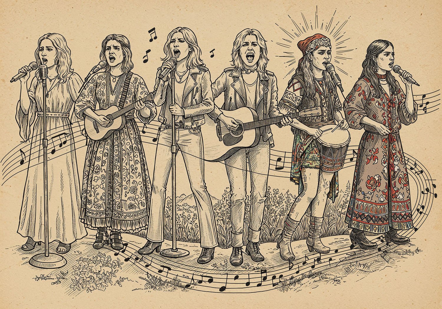 Traditional detailed engraving illustration with modern elements, etched lines, high contrast black and white, meticulous cross-hatching to create depth, printed on aged parchment paper of: Traditional detailed engraving illustration with modern elements, etched lines, high contrast black and white, meticulous cross-hatching to create depth, printed on aged parchment paper of: Five iconic Polish female singers from different eras standing together on a stage shaped like a timeline winding through Polish landscapes from the 1960s to the present: Anna German in a flowing 1970s dress holding a vintage microphone with soft musical notes emanating from her lips, Kora in a rebellious 1980s leather jacket shouting passionately into a mic with electric guitar riffs exploding behind her, Edyta Bartosiewicz in 1990s casual attire strumming an acoustic guitar with emotional waves radiating from her, Kayah in vibrant multicultural attire blending Balkan and African patterns dancing with rhythmic world music instruments like a tambourine and drum, Monika Brodka in modern 2010s edgy outfit whispering into a futuristic mic with abstract electronic sound waves and folk elements merging, all connected by a flowing ribbon of musical staff lines symbolizing vocal evolution and strength. Illustration: copperplate etching texture, ink lines, dramatic shading, artistic style, deep focus, museum quality print with humorous twist. Illustration: copperplate etching texture, ink lines, dramatic shading, artistic style, deep focus, museum quality print with humorous twist.