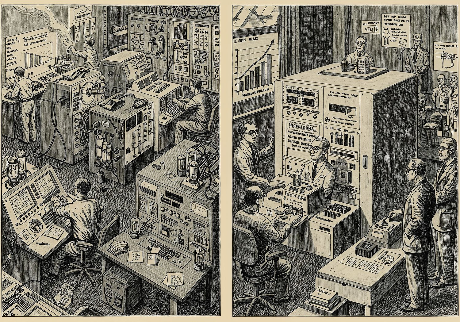 Traditional detailed engraving illustration with modern elements, etched lines, high contrast black and white, meticulous cross-hatching to create depth, printed on aged parchment paper of: Traditional detailed engraving illustration with modern elements, etched lines, high contrast black and white, meticulous cross-hatching to create depth, printed on aged parchment paper of: A split-scene illustration showing the transition from vacuum tube computers to transistor-based ones: on the left, a bulky 1950s computer room filled with glowing vacuum tubes, engineers repairing overheating machines amid sparks and smoke, with high energy bills and failure charts in the background; on the right, a sleek IBM mainframe with compact transistors, scientists at Bell Labs holding the first transistor prototype, graphs depicting halved failures and energy costs, rising revenue charts, and business executives shaking hands over new contracts, symbolizing technological and business revolution in the 1950s computing era. Illustration: copperplate etching texture, ink lines, dramatic shading, artistic style, deep focus, museum quality print with humorous twist. Illustration: copperplate etching texture, ink lines, dramatic shading, artistic style, deep focus, museum quality print with humorous twist.