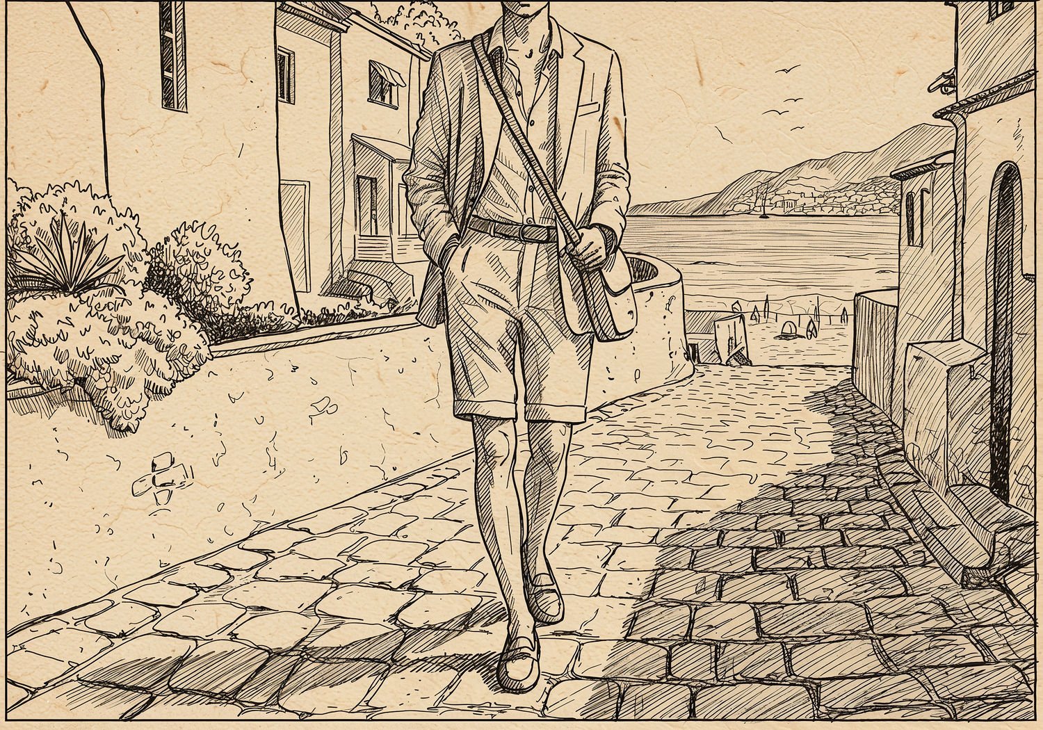 Traditional detailed engraving illustration with modern elements, etched lines, high contrast black and white, meticulous cross-hatching to create depth, printed on aged parchment paper of: Traditional detailed engraving illustration with modern elements, etched lines, high contrast black and white, meticulous cross-hatching to create depth, printed on aged parchment paper of: A stylish person wearing a loose beige linen blazer over a light white shirt, khaki shorts ending above the knee, and brown loafers, strolling along a cobblestone street in a charming seaside town with pastel-colored buildings, the sea and beach visible in the background under a bright summer sun, carrying a small canvas crossbody bag, with a gentle sea breeze implied by slightly tousled hair. Illustration: copperplate etching texture, ink lines, dramatic shading, artistic style, deep focus, museum quality print with humorous twist. Illustration: copperplate etching texture, ink lines, dramatic shading, artistic style, deep focus, museum quality print with humorous twist.