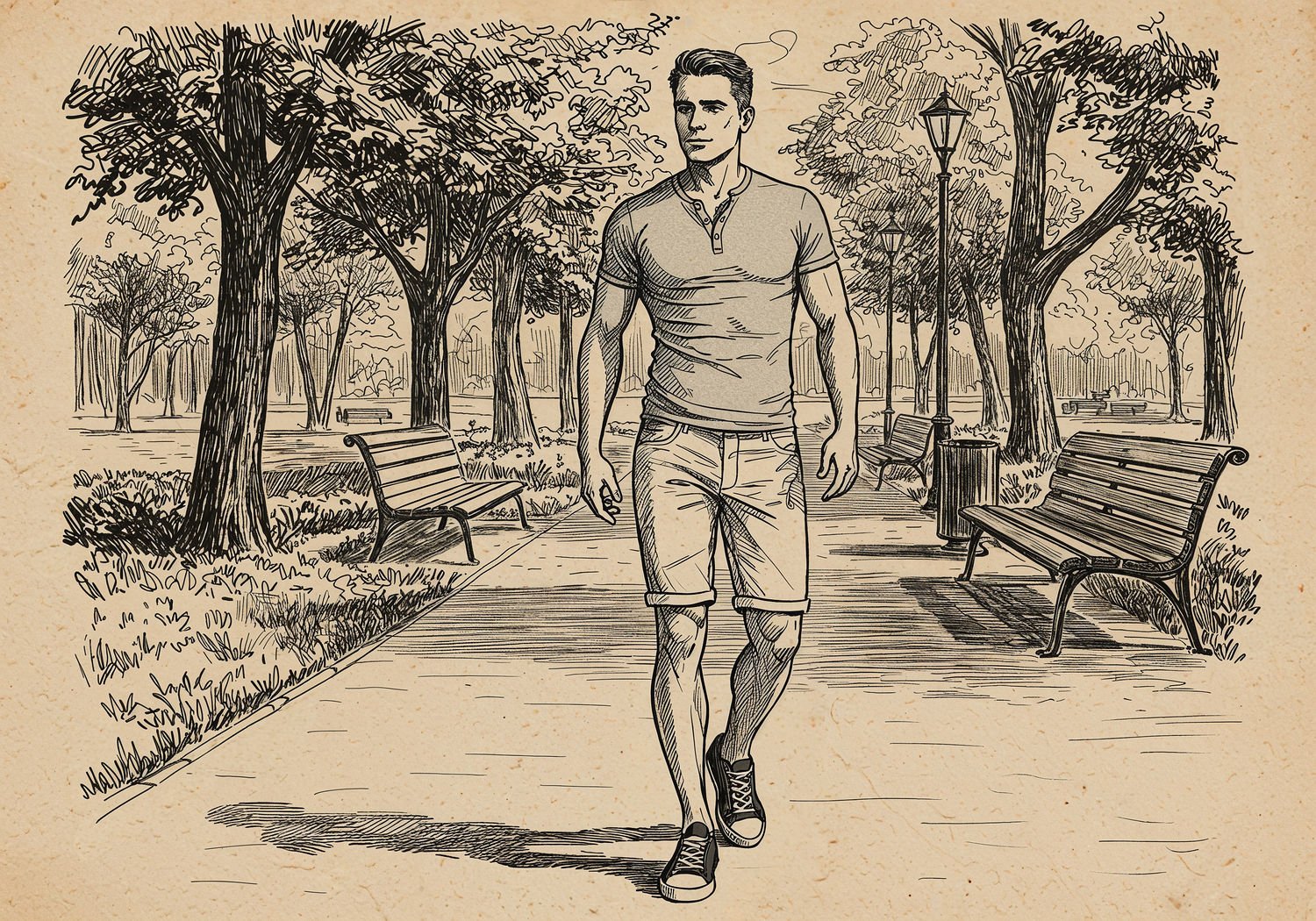 Traditional detailed engraving illustration with modern elements, etched lines, high contrast black and white, meticulous cross-hatching to create depth, printed on aged parchment paper of: Traditional detailed engraving illustration with modern elements, etched lines, high contrast black and white, meticulous cross-hatching to create depth, printed on aged parchment paper of: A fit man in his 20s or 30s walking casually along a tree-lined park path on a sunny summer day, wearing a fitted gray Henley shirt with short sleeves and 2-3 buttons at the V-neck collar partially unbuttoned to show chest, slim-fit beige shorts ending mid-thigh, and low-top black canvas sneakers with white soles, his biceps slightly flexed as he gestures with one arm, green grass and benches in the background, light breeze implied by subtle movement in leaves. Illustration: copperplate etching texture, ink lines, dramatic shading, artistic style, deep focus, museum quality print with humorous twist. Illustration: copperplate etching texture, ink lines, dramatic shading, artistic style, deep focus, museum quality print with humorous twist.