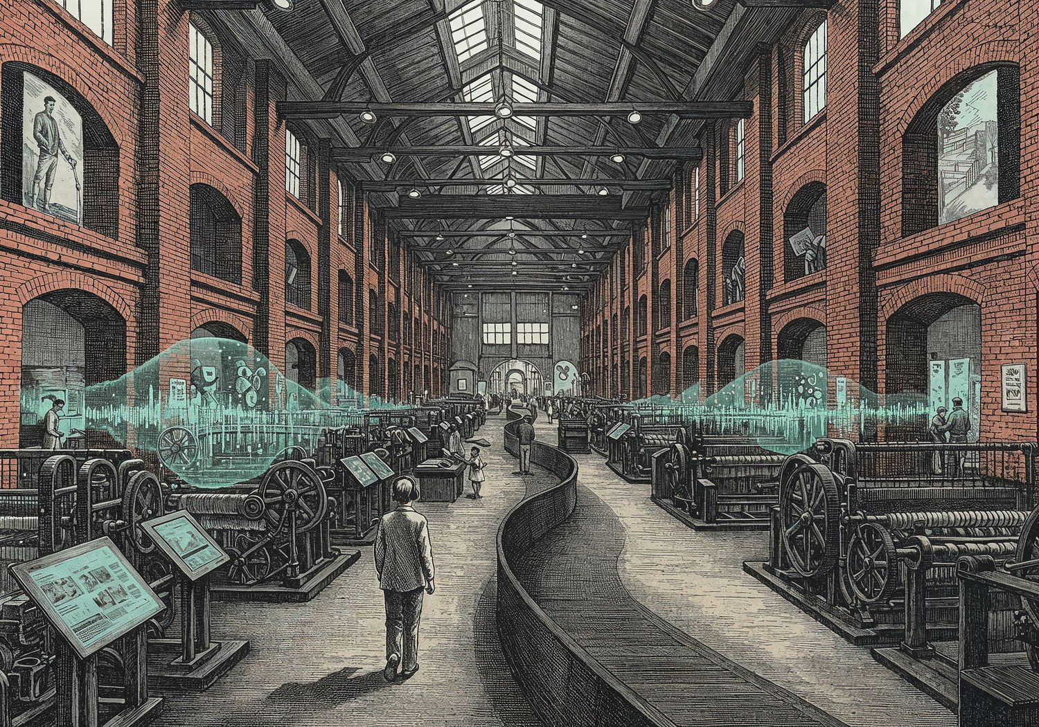 Traditional detailed engraving illustration with modern elements, etched lines, high contrast black and white, meticulous cross-hatching to create depth, printed on aged parchment paper of: Traditional detailed engraving illustration with modern elements, etched lines, high contrast black and white, meticulous cross-hatching to create depth, printed on aged parchment paper of: A visitor with headphones walks along a winding path through the vast red brick halls of the historic Scheibler factory in Łódź, surrounded by preserved industrial machinery like old looms and steam engines; ethereal sound waves visualized as glowing ripples emanate from interactive panels on the walls, blending with faint ghostly silhouettes of 19th-century workers operating the machines, while modern elements like a nearby garden with sculptures and a distant crowd in the revitalized Manufaktura complex appear in the background. Illustration: copperplate etching texture, ink lines, dramatic shading, artistic style, deep focus, museum quality print with humorous twist. Illustration: copperplate etching texture, ink lines, dramatic shading, artistic style, deep focus, museum quality print with humorous twist.