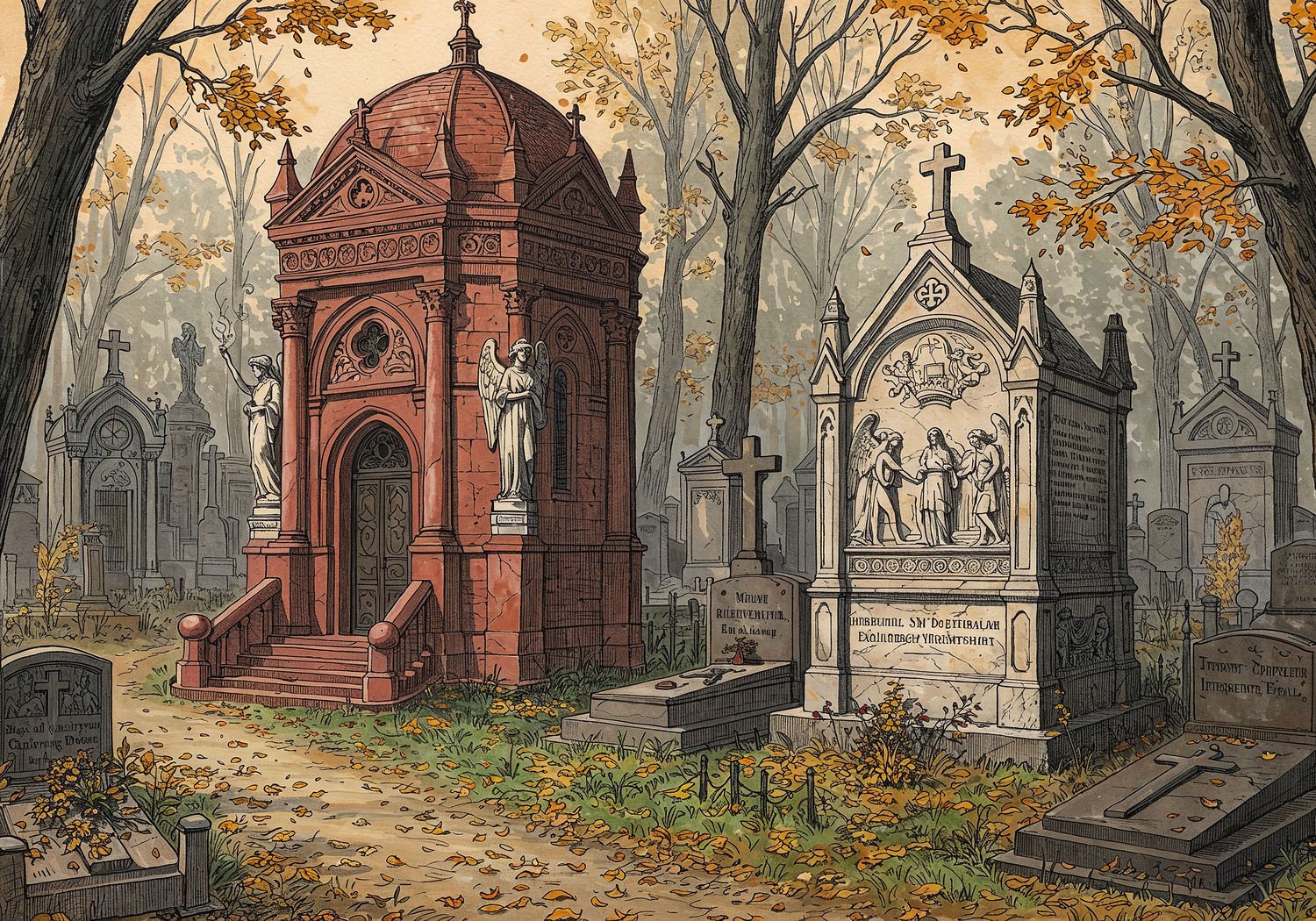 Traditional detailed engraving illustration with modern elements, etched lines, high contrast black and white, meticulous cross-hatching to create depth, printed on aged parchment paper of: Traditional detailed engraving illustration with modern elements, etched lines, high contrast black and white, meticulous cross-hatching to create depth, printed on aged parchment paper of: A majestic Evangelical cemetery in Łódź during autumn, with golden falling leaves from trees carpeting the ground and paths. In the foreground, a grand neogothic mausoleum of red sandstone with a domed roof, surrounded by columns, featuring sculptures of angels with outstretched wings holding torches and harps. Nearby, a detailed epitaph on a marble sarcophagus depicts reliefs of textile workers and biblical scenes, inscribed in German about industrial magnates. A winding path leads through the cemetery, passing other ornate tombs with lions and mozaics, under a misty sky, evoking a sense of historical mystery and industrial legacy. Illustration: copperplate etching texture, ink lines, dramatic shading, artistic style, deep focus, museum quality print with humorous twist. Illustration: copperplate etching texture, ink lines, dramatic shading, artistic style, deep focus, museum quality print with humorous twist.