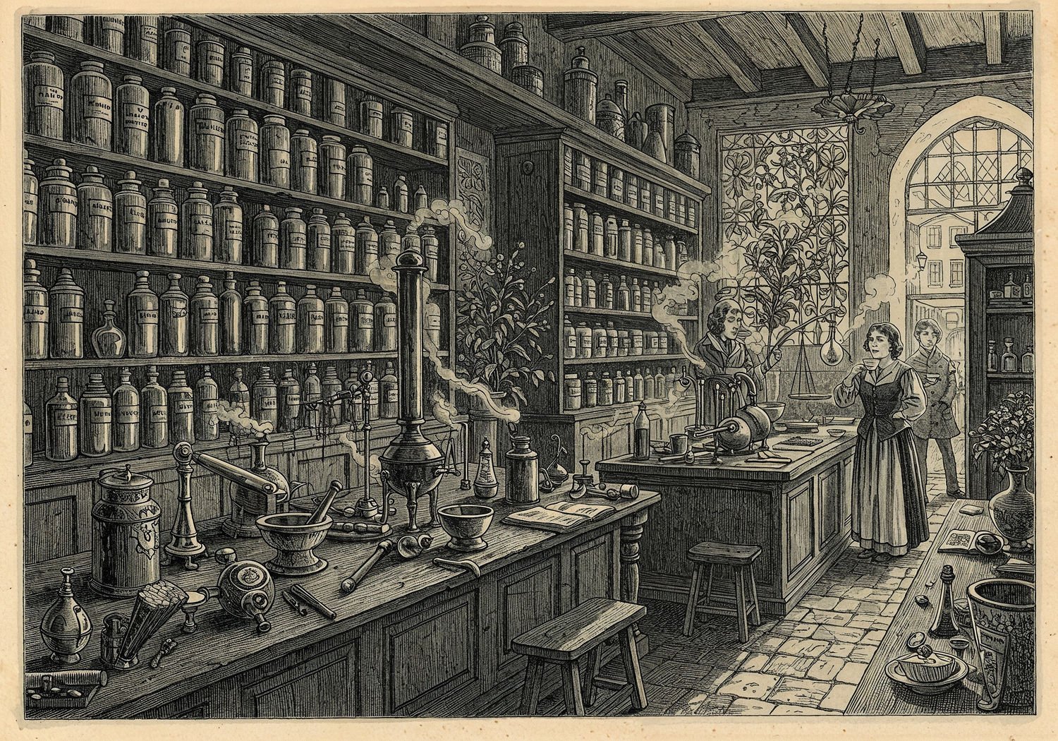 Traditional detailed engraving illustration with modern elements, etched lines, high contrast black and white, meticulous cross-hatching to create depth, printed on aged parchment paper of: Traditional detailed engraving illustration with modern elements, etched lines, high contrast black and white, meticulous cross-hatching to create depth, printed on aged parchment paper of: A dimly lit historical apothecary room in Kraków’s Museum of Pharmacy, with wooden shelves lined with green-tinted glass jars filled with mysterious elixirs and poisons like arsenic and belladonna, labeled in Latin and old Polish script; antique tools including agate mortars, alembics for distillation, and ivory scales scattered on a wooden table; faint herbal scents visualized as swirling vapors; in the background, a visitor in modern clothes tasting a herbal tea from a porcelain cup while a guide in period attire explains an exhibit; subtle Kraków elements like stained glass windows with plant motifs and a view of cobblestone streets outside. Illustration: copperplate etching texture, ink lines, dramatic shading, artistic style, deep focus, museum quality print with humorous twist. Illustration: copperplate etching texture, ink lines, dramatic shading, artistic style, deep focus, museum quality print with humorous twist.