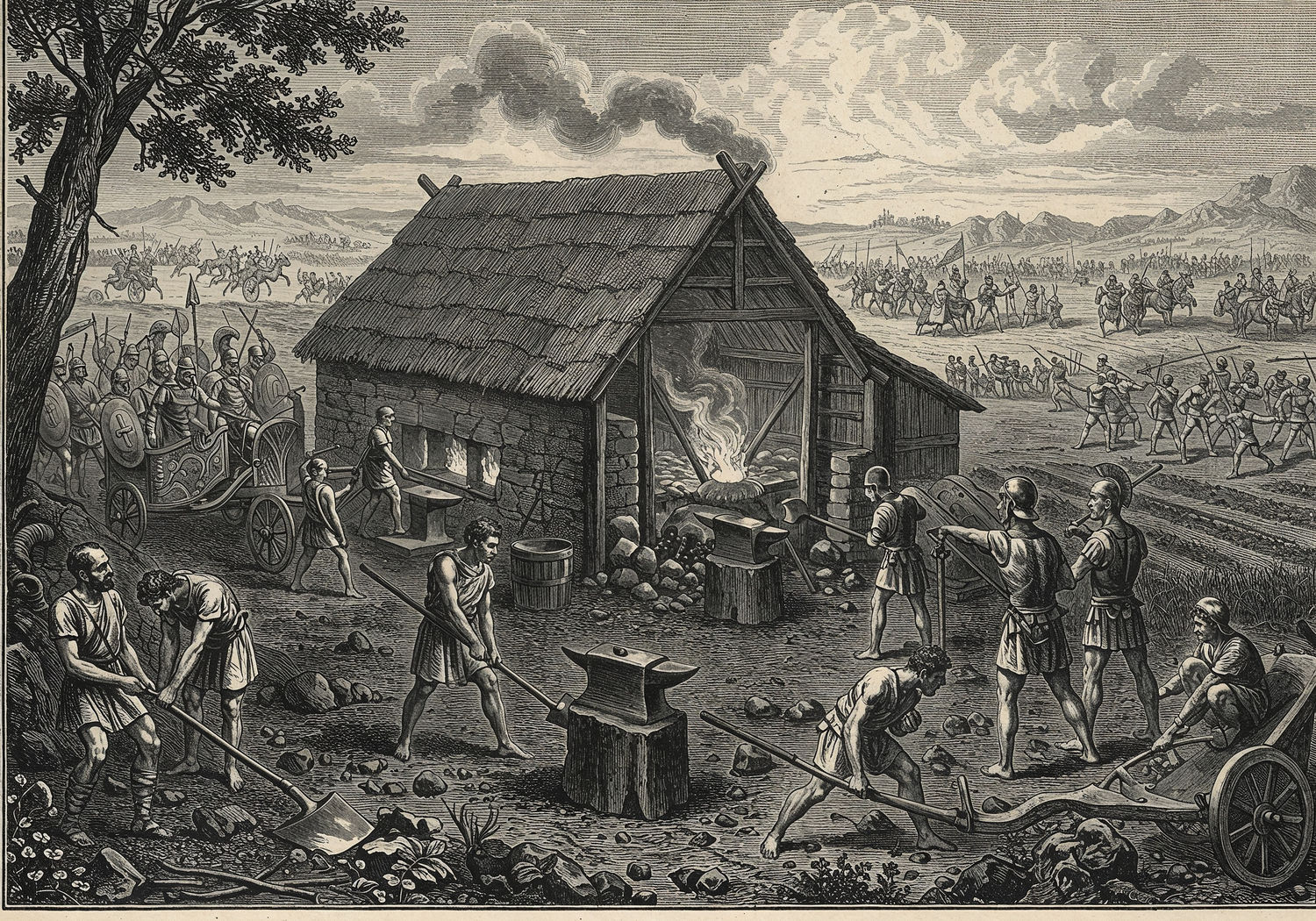 Traditional detailed engraving illustration with modern elements, etched lines, high contrast black and white, meticulous cross-hatching to create depth, printed on aged parchment paper of: Traditional detailed engraving illustration with modern elements, etched lines, high contrast black and white, meticulous cross-hatching to create depth, printed on aged parchment paper of: Ancient blacksmiths forging iron swords and plows in a hut with glowing furnaces, surrounded by abundant iron ore deposits; in the foreground, diverse farmers using iron tools to till fertile fields and harvest crops, while in the background, a mass of infantry soldiers armed with iron spears and shields charge into battle against bronze-equipped warriors on chariots, with Roman legions and Chinese armies visible on distant hills. Illustration: copperplate etching texture, ink lines, dramatic shading, artistic style, deep focus, museum quality print with humorous twist. Illustration: copperplate etching texture, ink lines, dramatic shading, artistic style, deep focus, museum quality print with humorous twist.