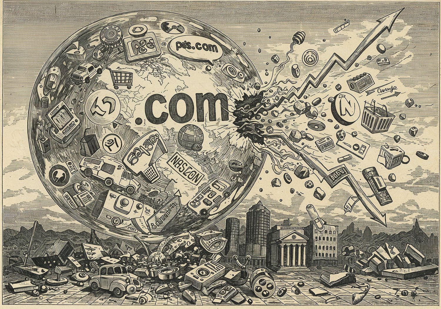 Traditional detailed engraving illustration with modern elements, etched lines, high contrast black and white, meticulous cross-hatching to create depth, printed on aged parchment paper of: Traditional detailed engraving illustration with modern elements, etched lines, high contrast black and white, meticulous cross-hatching to create depth, printed on aged parchment paper of: A large, inflating soap bubble shaped like a globe with „.com” text, filled with icons of early internet symbols including shopping carts, dogs for Pets.com, delivery vans for Webvan, and stock charts rising sharply; the bubble is bursting dramatically, spilling out falling dollar bills, broken company logos, and plummeting Nasdaq graphs, while in the foreground, sturdy icons of Amazon and Google buildings remain intact amidst the debris, symbolizing survival and lessons for sustainable tech growth. Illustration: copperplate etching texture, ink lines, dramatic shading, artistic style, deep focus, museum quality print with humorous twist. Illustration: copperplate etching texture, ink lines, dramatic shading, artistic style, deep focus, museum quality print with humorous twist.