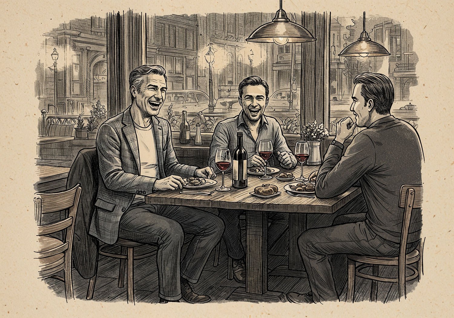 Traditional detailed engraving illustration with modern elements, etched lines, high contrast black and white, meticulous cross-hatching to create depth, printed on aged parchment paper of: Traditional detailed engraving illustration with modern elements, etched lines, high contrast black and white, meticulous cross-hatching to create depth, printed on aged parchment paper of: A mature man in his forties wearing a gray plaid blazer over a plain white t-shirt and dark indigo straight-leg jeans, sitting at a wooden table in a cozy urban bistro restaurant during evening, laughing and conversing with two male friends across from him, plates of food and glasses of wine on the table, warm ambient lighting from pendant lamps, city street visible through large windows in the background. Illustration: copperplate etching texture, ink lines, dramatic shading, artistic style, deep focus, museum quality print with humorous twist. Illustration: copperplate etching texture, ink lines, dramatic shading, artistic style, deep focus, museum quality print with humorous twist.