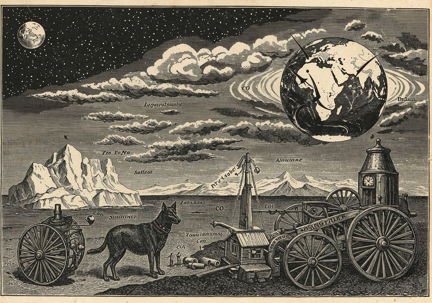 Traditional detailed engraving illustration with modern elements, etched lines, high contrast black and white, meticulous cross-hatching to create depth, printed on aged parchment paper of: Traditional detailed engraving illustration with modern elements, etched lines, high contrast black and white, meticulous cross-hatching to create depth, printed on aged parchment paper of: A global view of Earth from space, showing geoengineering interventions: brightened marine clouds over oceans reflecting sunlight, stratospheric aerosol layers blocking solar radiation, expanding green forests absorbing CO2, ocean surfaces blooming with stimulated phytoplankton, and industrial direct air capture facilities filtering atmospheric carbon, contrasted with subtle risks like disrupted monsoon rains, melting polar ice unevenly, and symbolic ethical scales balancing hope and danger. Illustration: copperplate etching texture, ink lines, dramatic shading, artistic style, deep focus, museum quality print with humorous twist. Illustration: copperplate etching texture, ink lines, dramatic shading, artistic style, deep focus, museum quality print with humorous twist.