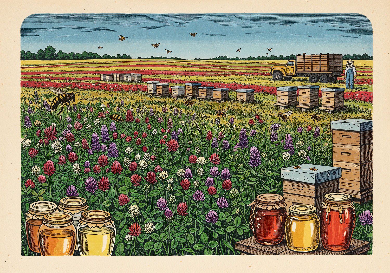 Traditional detailed engraving illustration with modern elements, etched lines, high contrast black and white, meticulous cross-hatching to create depth, printed on aged parchment paper of: Vast prairie landscape under a clear blue sky, with expansive golden fields of blooming red and white clover interspersed with purple alfalfa flowers, busy honeybees flying and collecting nectar from the dense flower heads, wooden beehives clustered on the field edge, a beekeeper in overalls standing nearby with a truck loaded with hives in the background, jars of light golden honey glowing in the foreground, evoking abundance and symbiosis in North American farmlands. Illustration: copperplate etching texture, ink lines, dramatic shading, artistic style, deep focus, museum quality print with humorous twist.
