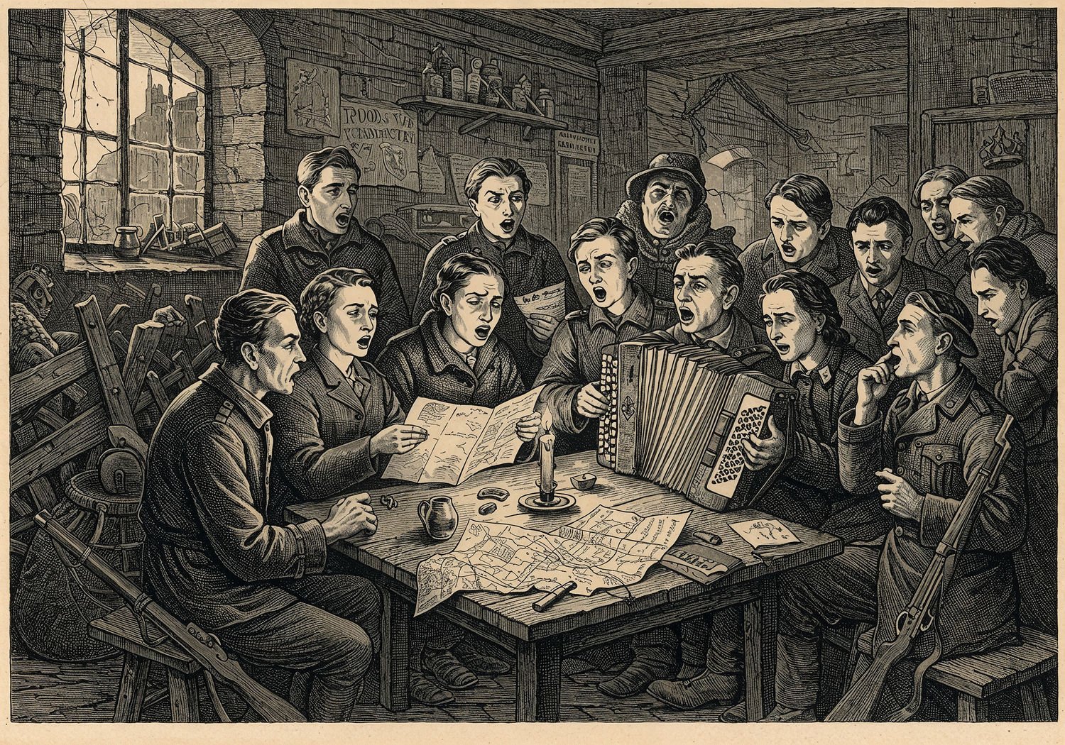Traditional detailed engraving illustration with modern elements, etched lines, high contrast black and white, meticulous cross-hatching to create depth, printed on aged parchment paper of: Traditional detailed engraving illustration with modern elements, etched lines, high contrast black and white, meticulous cross-hatching to create depth, printed on aged parchment paper of: A group of Polish resistance fighters and civilians huddled in a dimly lit basement in occupied Warsaw during World War II, singing conspiratorial songs together around a small candlelit table, with one person playing a simple accordion, maps and weapons subtly placed nearby, expressions of determination and hope on their faces, faint outlines of barricades and ruined streets visible through a cracked window in the background. Illustration: copperplate etching texture, ink lines, dramatic shading, artistic style, deep focus, museum quality print with humorous twist. Illustration: copperplate etching texture, ink lines, dramatic shading, artistic style, deep focus, museum quality print with humorous twist.