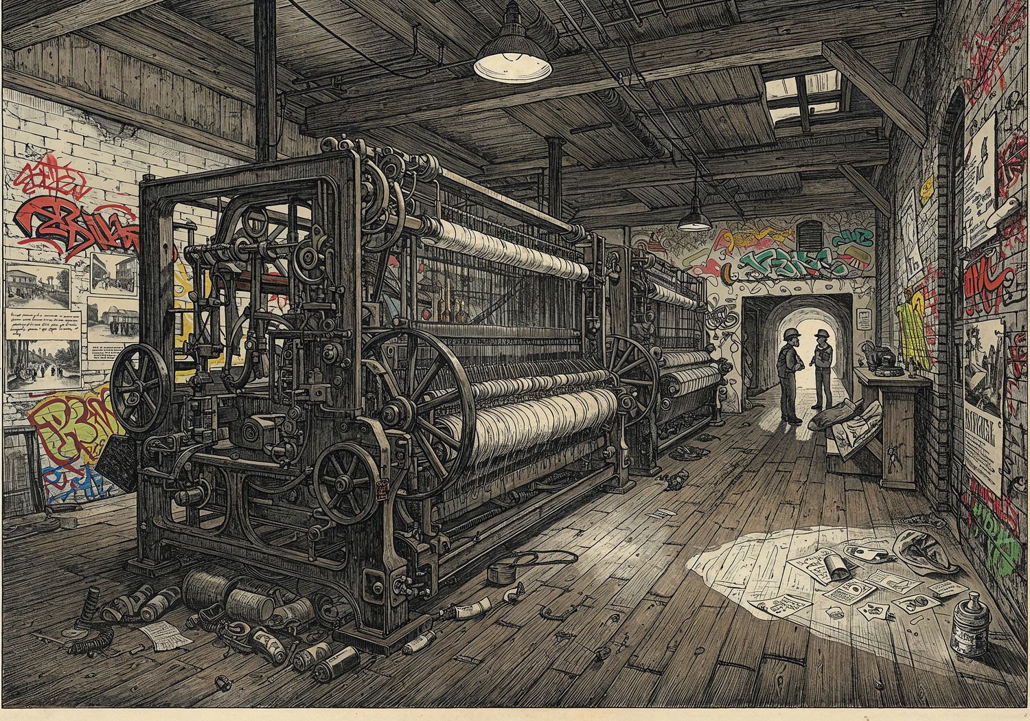 Traditional detailed engraving illustration with modern elements, etched lines, high contrast black and white, meticulous cross-hatching to create depth, printed on aged parchment paper of: Traditional detailed engraving illustration with modern elements, etched lines, high contrast black and white, meticulous cross-hatching to create depth, printed on aged parchment paper of: A dimly lit museum interior in an old Łódź factory building, featuring rusty 19th-century textile looms with broken gears and remnants of thread, colorful graffiti-covered walls transferred from abandoned sites, scattered artifacts like old worker photographs, fabric spools, and spray paint cans, visitors in safety helmets exploring an interactive tunnel with projected shadows of explorers using flashlights, evoking a sense of hidden industrial history and urban adventure. Illustration: copperplate etching texture, ink lines, dramatic shading, artistic style, deep focus, museum quality print with humorous twist. Illustration: copperplate etching texture, ink lines, dramatic shading, artistic style, deep focus, museum quality print with humorous twist.