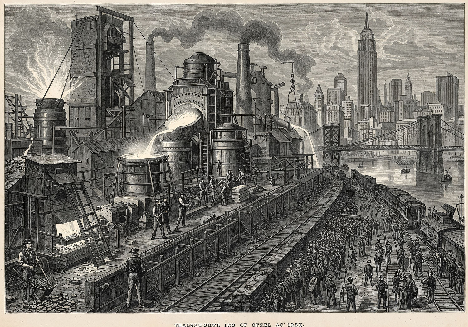 Traditional detailed engraving illustration with modern elements, etched lines, high contrast black and white, meticulous cross-hatching to create depth, printed on aged parchment paper of: Traditional detailed engraving illustration with modern elements, etched lines, high contrast black and white, meticulous cross-hatching to create depth, printed on aged parchment paper of: A historical progression scene showing the evolution of steel production and urban development: on the left, an 18th-century industrial furnace in Coalbrookdale with Abraham Darby overseeing workers loading coke into a glowing blast furnace producing molten iron; in the center, a 19th-century steel mill featuring a Bessemer converter blowing air into liquid iron to create steel, surrounded by Siemens-Martin open-hearth furnaces with workers and molten metal pouring; on the right, a bustling early 20th-century New York cityscape with the Brooklyn Bridge spanning a river, the Home Insurance Building as an early skyscraper, and the Empire State Building rising prominently amid a dense skyline of steel-framed towers, trains on steel rails, and crowds of urban workers migrating to the city. Illustration: copperplate etching texture, ink lines, dramatic shading, artistic style, deep focus, museum quality print with humorous twist. Illustration: copperplate etching texture, ink lines, dramatic shading, artistic style, deep focus, museum quality print with humorous twist.