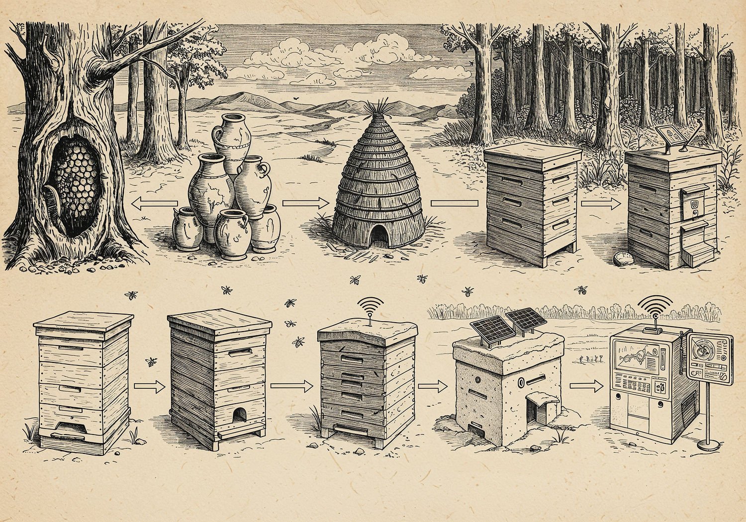 Traditional detailed engraving illustration with modern elements, etched lines, high contrast black and white, meticulous cross-hatching to create depth, printed on aged parchment paper of: A horizontal timeline illustrating the evolution of beehive architecture: on the left, a natural tree hollow with bees building hexagonal wax combs inside a forest trunk; progressing to an ancient Egyptian cylindrical clay pot hive stacked horizontally in a desert landscape; then a medieval European straw skep beehive in a garden; followed by a wooden log hive with a side entrance in a Scandinavian forest; next, a 19th-century Langstroth vertical wooden frame hive with removable frames; then a modern polystyrene insulated hive in a snowy field; and on the right, a futuristic intelligent hive with embedded sensors, solar panels, IoT devices, and AI monitoring screens, surrounded by diverse global environments like forests, deserts, and farms. Illustration: copperplate etching texture, ink lines, dramatic shading, artistic style, deep focus, museum quality print with humorous twist.