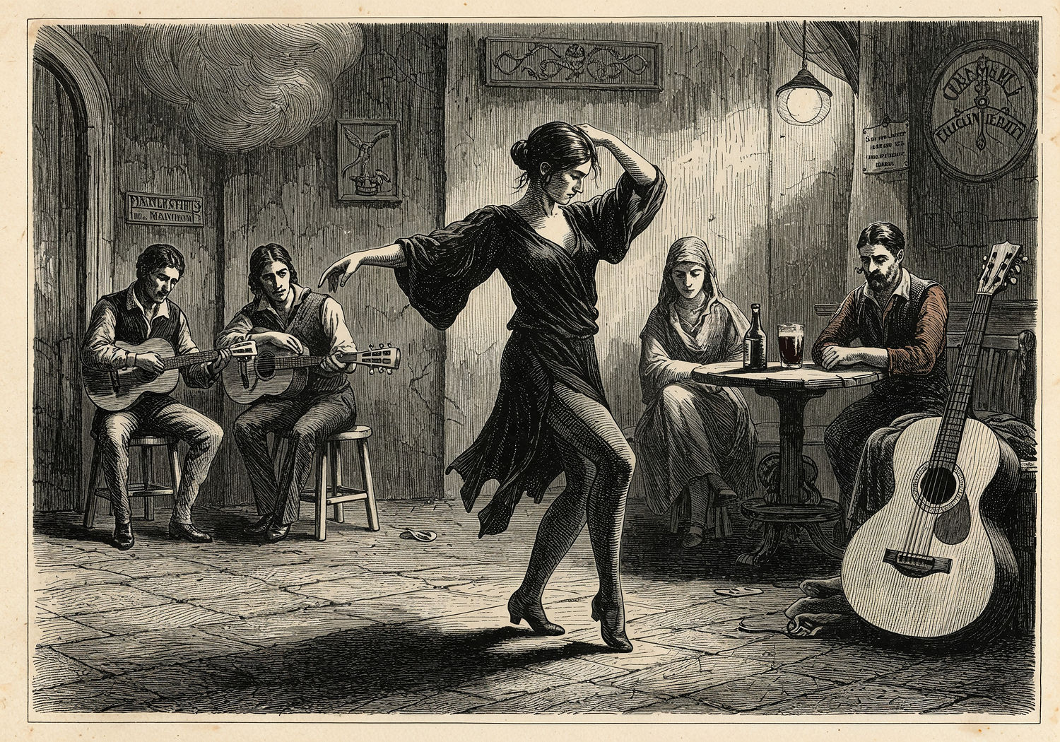 Traditional detailed engraving illustration with modern elements, etched lines, high contrast black and white, meticulous cross-hatching to create depth, printed on aged parchment paper of: Traditional detailed engraving illustration with modern elements, etched lines, high contrast black and white, meticulous cross-hatching to create depth, printed on aged parchment paper of: A Portuguese fado dancer in a long, loose black tunic with wide sleeves and an asymmetrical side slit revealing one leg, performing a slow, melancholic dance in a dimly lit, smoky tavern in Lisbon’s Alfama district, with a viola de fado guitar nearby and shadows suggesting hidden emotion and subtle rebellion. Illustration: copperplate etching texture, ink lines, dramatic shading, artistic style, deep focus, museum quality print with humorous twist. Illustration: copperplate etching texture, ink lines, dramatic shading, artistic style, deep focus, museum quality print with humorous twist.