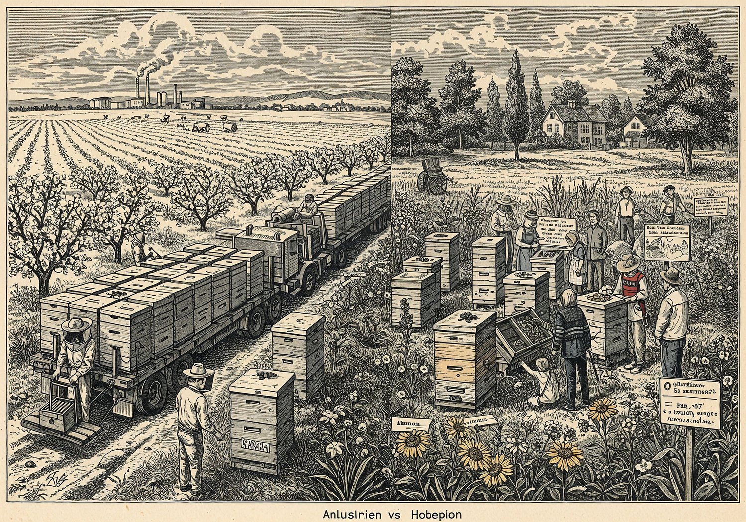 Traditional detailed engraving illustration with modern elements, etched lines, high contrast black and white, meticulous cross-hatching to create depth, printed on aged parchment paper of: A split-scene illustration contrasting industrial and hobbyist beekeeping: on the left, a vast American or Argentine landscape with thousands of beehives stacked on flatbed trucks being transported across a field of blooming almond orchards or sunflowers, workers in protective suits using high-tech tools like sensors and extractors near large machinery, with distant factories and stressed bee swarms; on the right, a serene European village or urban park setting with a small cluster of 10-20 colorful beehives integrated among wildflower meadows and gardens, a diverse group of people including children and adults in casual attire gently inspecting hives during an educational workshop, observing a queen bee and worker bees pollinating local plants, with signs about biodiversity and sustainable practices nearby. Illustration: copperplate etching texture, ink lines, dramatic shading, artistic style, deep focus, museum quality print with humorous twist.