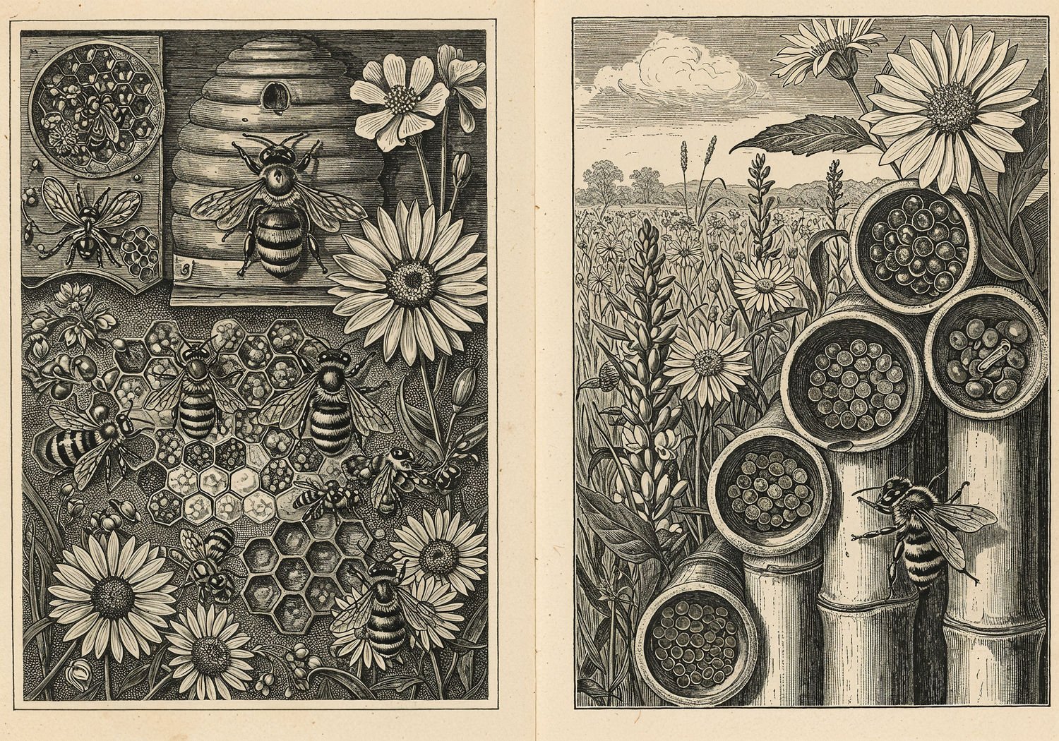 Traditional detailed engraving illustration with modern elements, etched lines, high contrast black and white, meticulous cross-hatching to create depth, printed on aged parchment paper of: A split-scene illustration contrasting honeybees and solitary wild bees: on the left, a detailed honeybee hive interior with a central queen bee laying eggs, worker bees dancing to communicate and collecting nectar from flowers outside, and drones nearby; on the right, solitary bees constructing nests in bamboo tubes by provisioning cells with pollen balls and nectar, one bee emerging from a tube while pollinating diverse wildflowers, with global ecosystems like European meadows and African savannas in the background to highlight biodiversity and symbiosis. Illustration: copperplate etching texture, ink lines, dramatic shading, artistic style, deep focus, museum quality print with humorous twist.