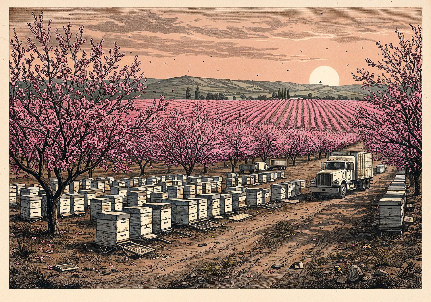 Traditional detailed engraving illustration with modern elements, etched lines, high contrast black and white, meticulous cross-hatching to create depth, printed on aged parchment paper of: A vast almond orchard in California’s San Joaquin Valley at dawn, with rows of blooming pink almond trees stretching to the horizon, thousands of white beehives stacked in dense clusters among the trees, bees swarming actively pollinating the flowers, several large semi-trucks loaded with beehive platforms parked nearby on a dirt road, evoking the scale of industrial migration and pollination efforts. Illustration: copperplate etching texture, ink lines, dramatic shading, artistic style, deep focus, museum quality print with humorous twist.