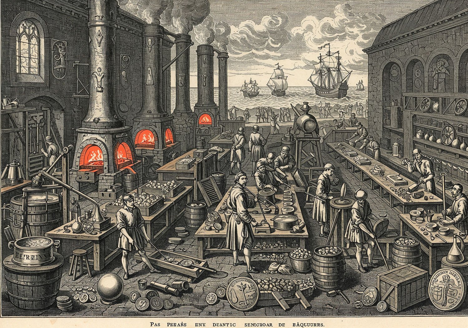 Traditional detailed engraving illustration with modern elements, etched lines, high contrast black and white, meticulous cross-hatching to create depth, printed on aged parchment paper of: Traditional detailed engraving illustration with modern elements, etched lines, high contrast black and white, meticulous cross-hatching to create depth, printed on aged parchment paper of: A bustling Renaissance mint workshop in 16th-century Europe, with tall shaft furnaces glowing red from intense heat, workers operating bellows and crushing silver ore with water-powered stamp mills, alchemists in robes mixing mercury and herbs near distillation apparatus, piles of raw ore from New World mines like Potosí arriving via wooden crates, molten silver being poured into coin molds, finished silver coins such as ducats and reales scattered on tables with royal emblems, a distant sailing ship on the horizon symbolizing Columbus’s voyages, and maps of the Americas in the background. Illustration: copperplate etching texture, ink lines, dramatic shading, artistic style, deep focus, museum quality print with humorous twist. Illustration: copperplate etching texture, ink lines, dramatic shading, artistic style, deep focus, museum quality print with humorous twist.